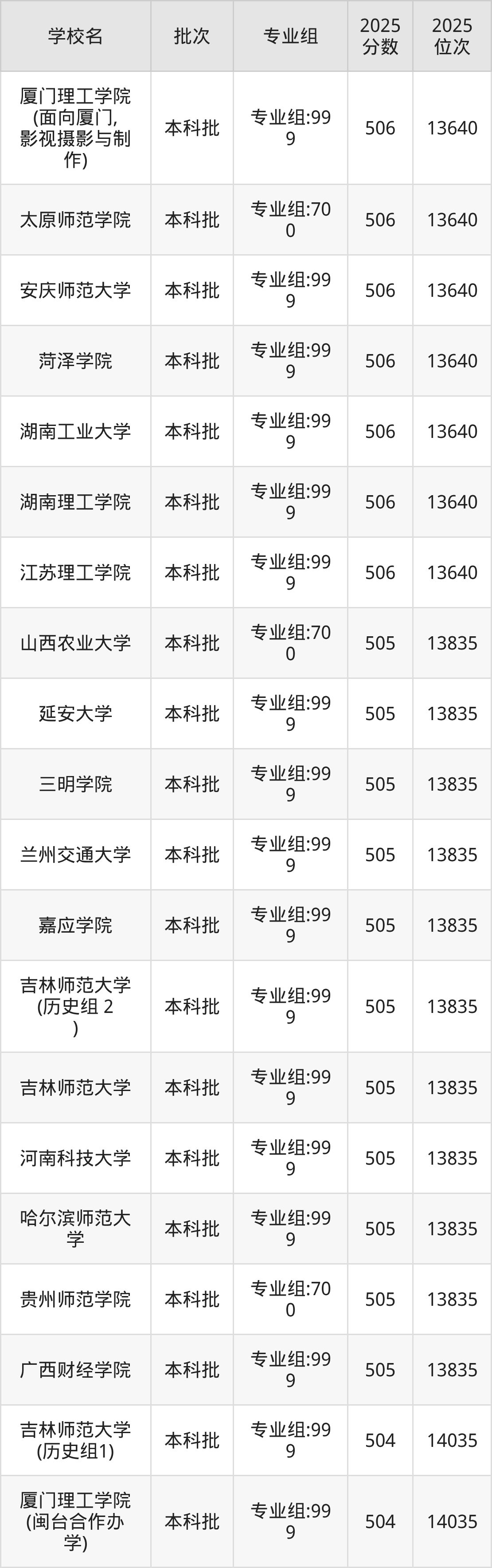 这些都是2026年高考历史类14036名~14221名考生可以报考的大学,更多学校名单如下表所示: