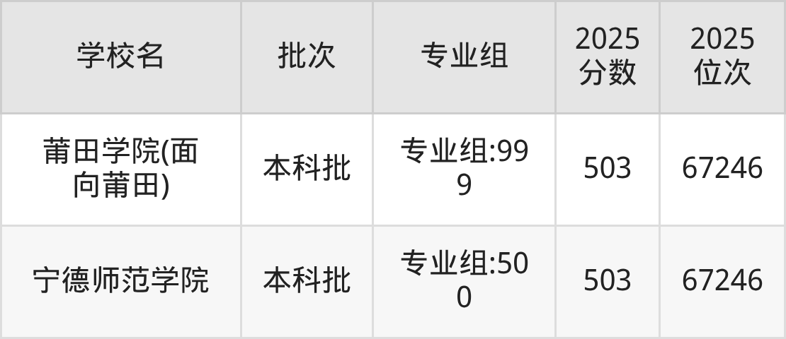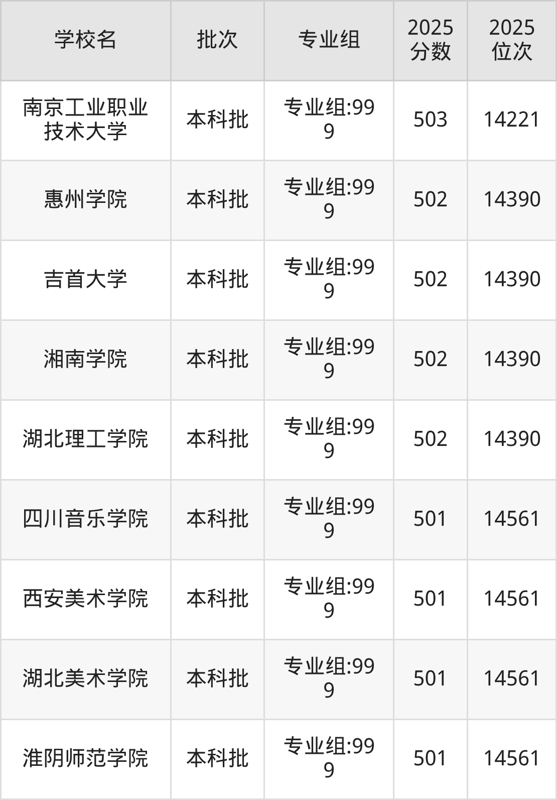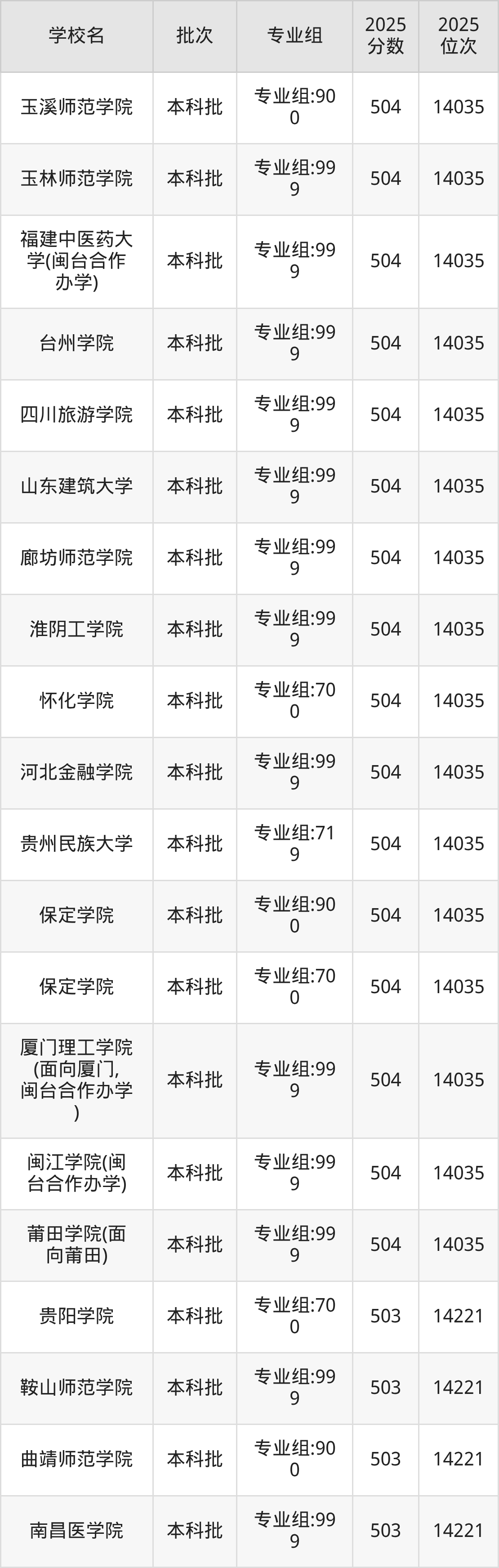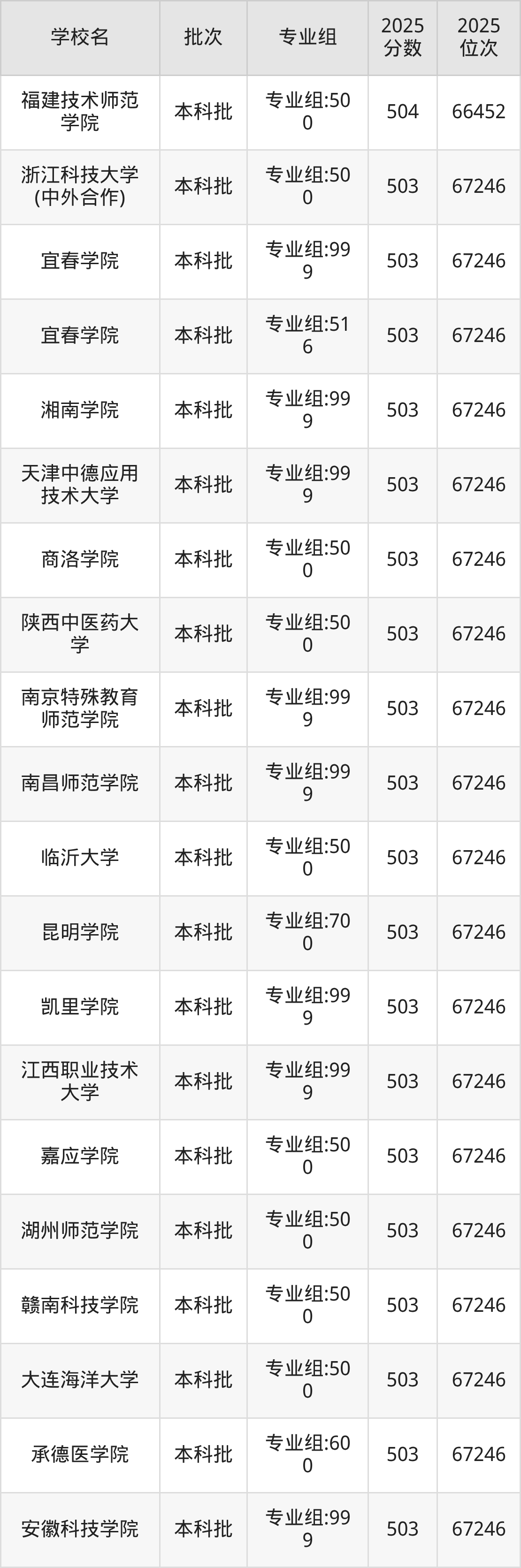 2025年福建高考历史类503分(14036名~14221名)能上的大学有鞍山师范学院专业组:999、贵阳学院专业组:700、南昌医学院专业组:999、南京工业职业技术大学专业组:999等。