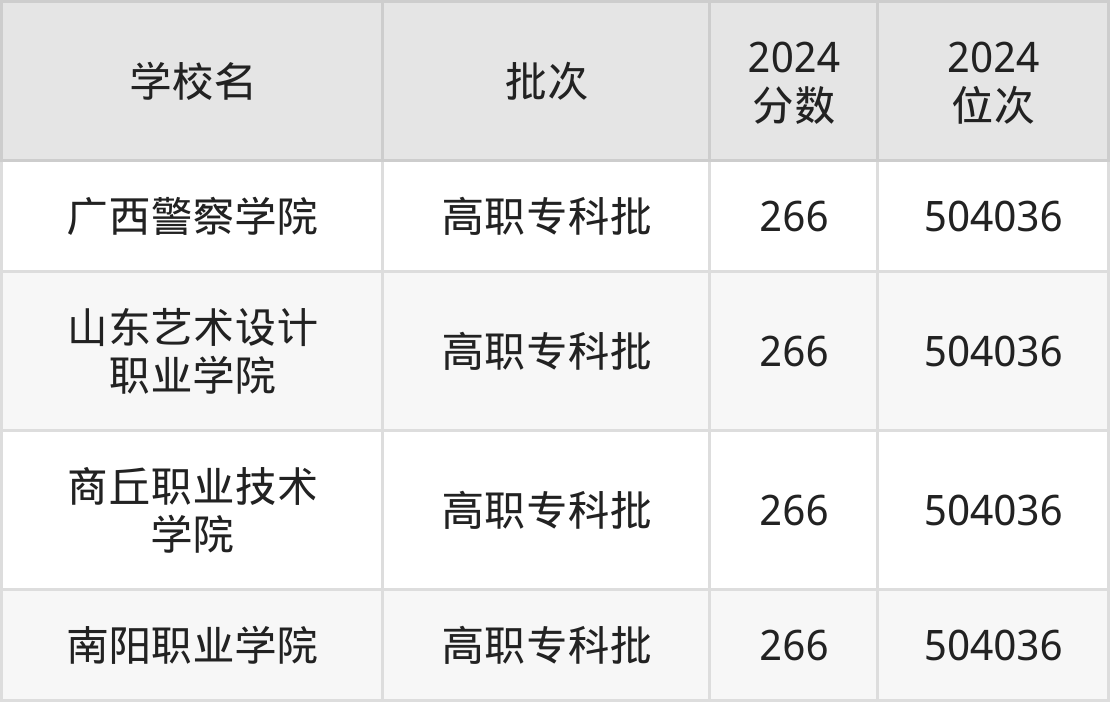 2024年河南高考理科266分(503083名~504037名)能上的大学有南阳职业学院、商丘职业技术学院、山东艺术设计职业学院、广西警察学院。
