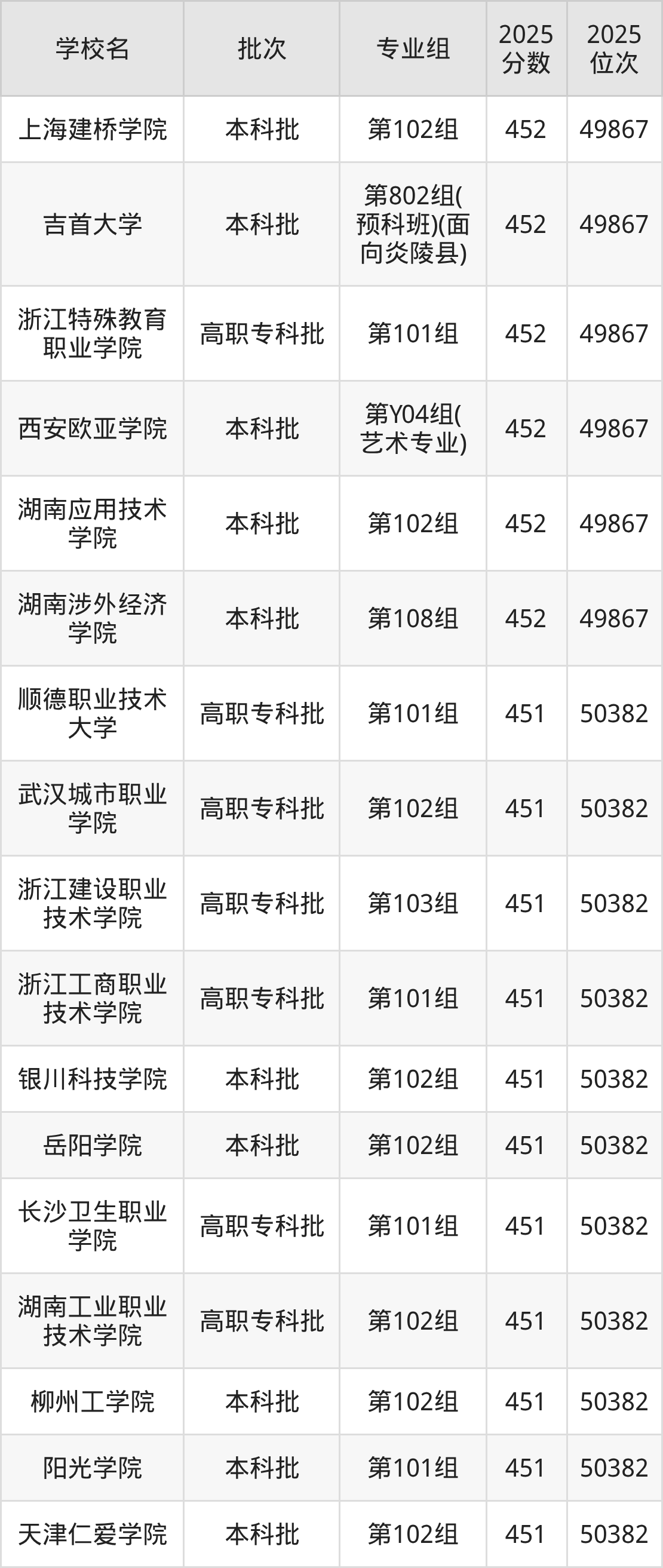 2025年湖南高考历史类451分(49868名~50382名)能上的大学有天津仁爱学院第102组、阳光学院第101组、柳州工学院第102组、岳阳学院第102组等。