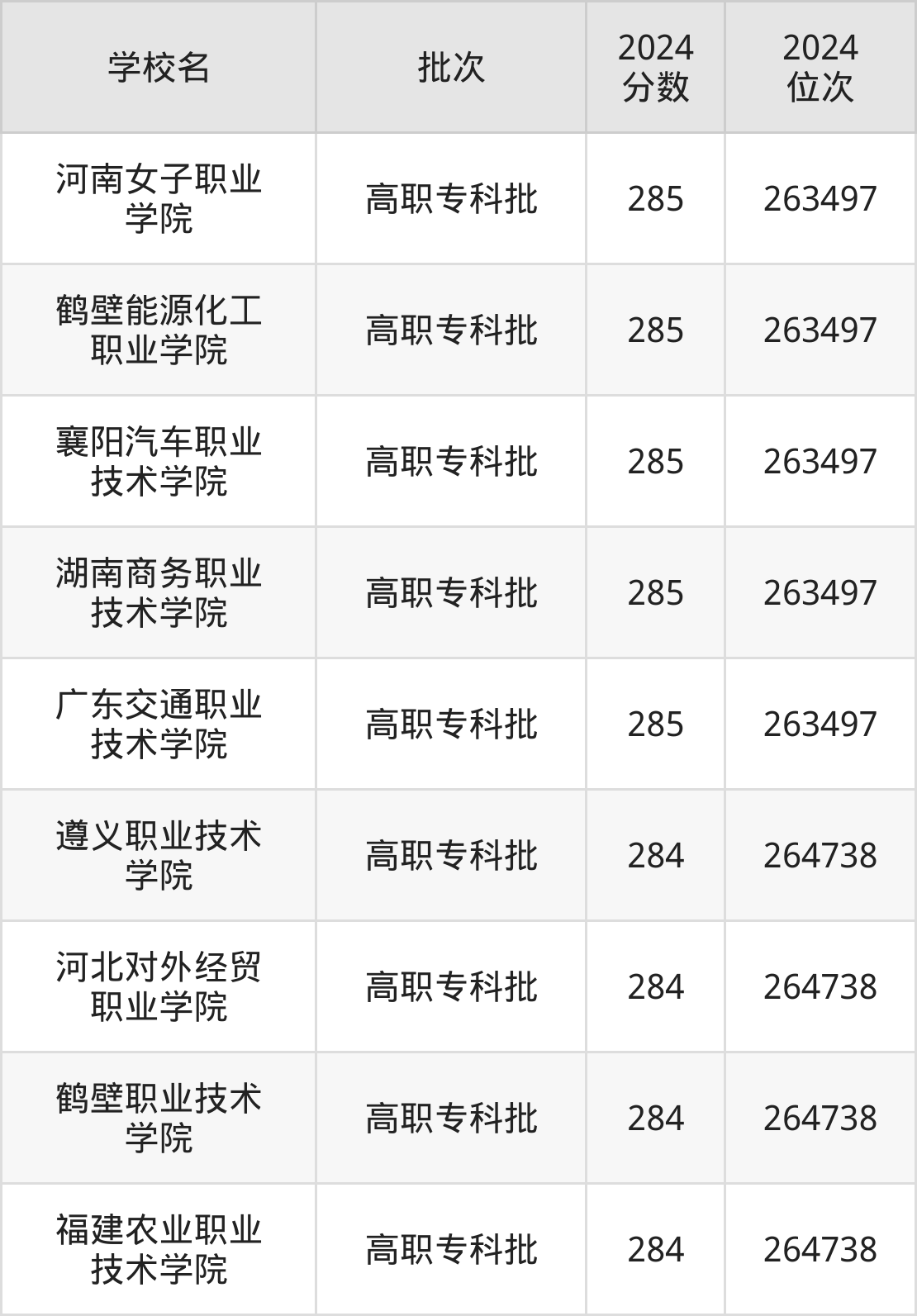 2024年河南高考文科284分(263498名~264738名)能上的大学有福建农业职业技术学院、鹤壁职业技术学院、河北对外经贸职业学院、遵义职业技术学院。