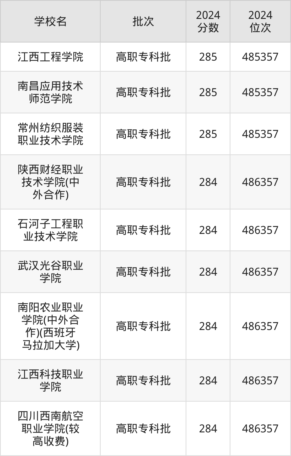2024年河南高考理科284分(485359名~486358名)能上的大学有江西科技职业学院、石河子工程职业技术学院、武汉光谷职业学院、四川西南航空职业学院(较高收费)等。