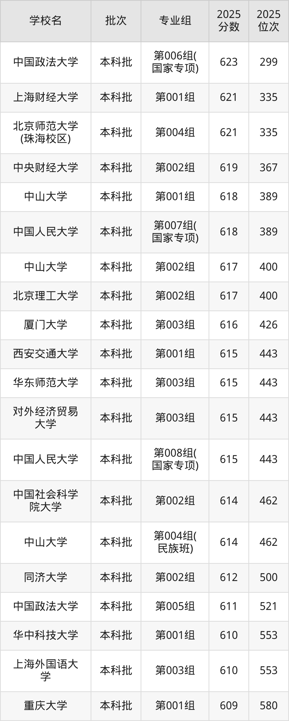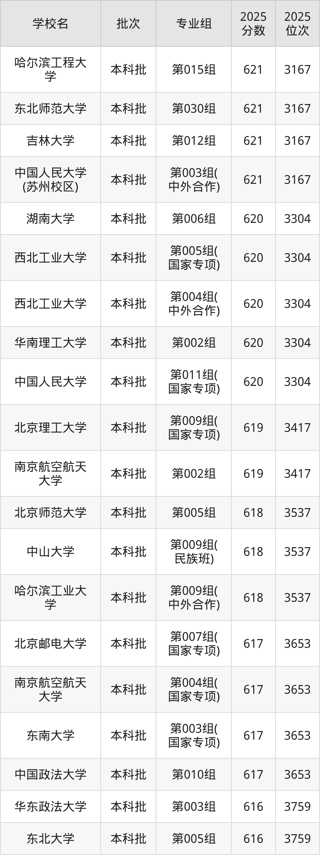 2025年黑龙江高考物理类616分(3654名~3759名)能上的大学有中国人民大学第012组(国家专项)、东北大学第005组、华东政法大学第003组。