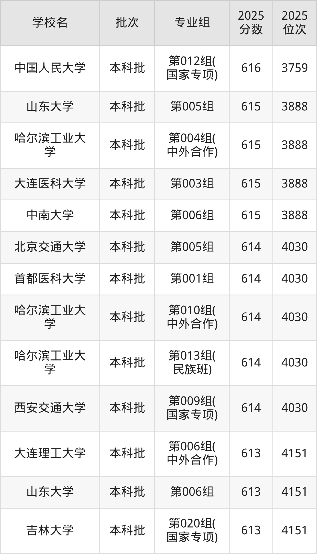 黑龙江高考616分:历史类排名426位、物理类排名3759位。该分数位次对应能上的大学历史类有厦门大学第003组;物理类有中国人民大学第012组(国家专项)、东北大学第005组,更多名单如下文所示,2026届考生可参考。