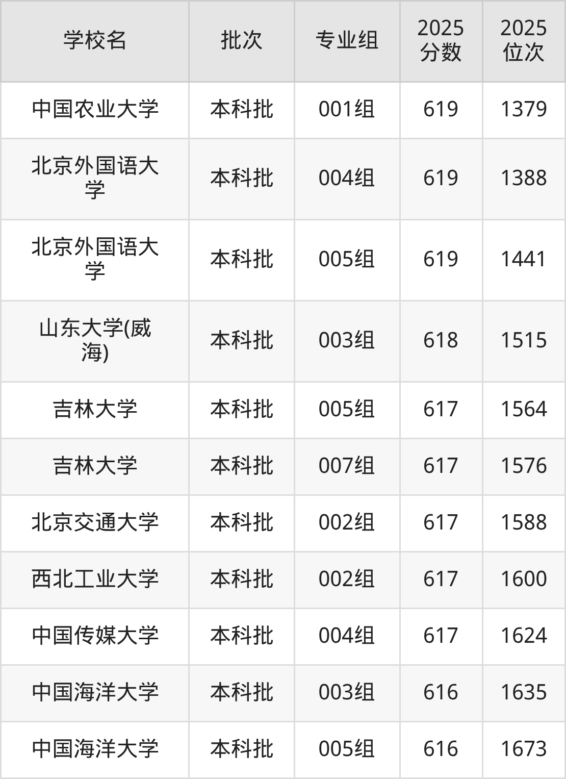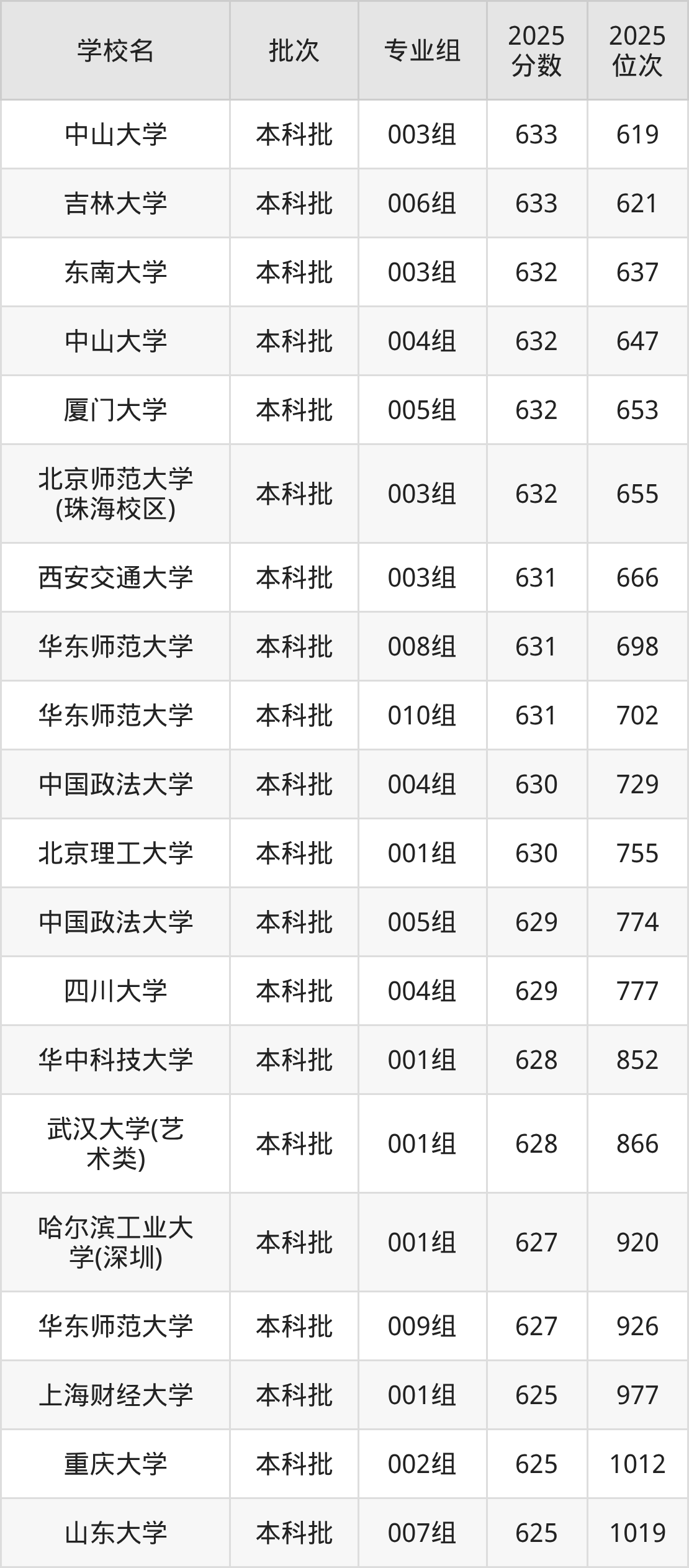 2025年安徽高考历史类623分(1109名~1179名)能上的大学有对外经济贸易大学005组、山东大学005组、苏州大学003组。