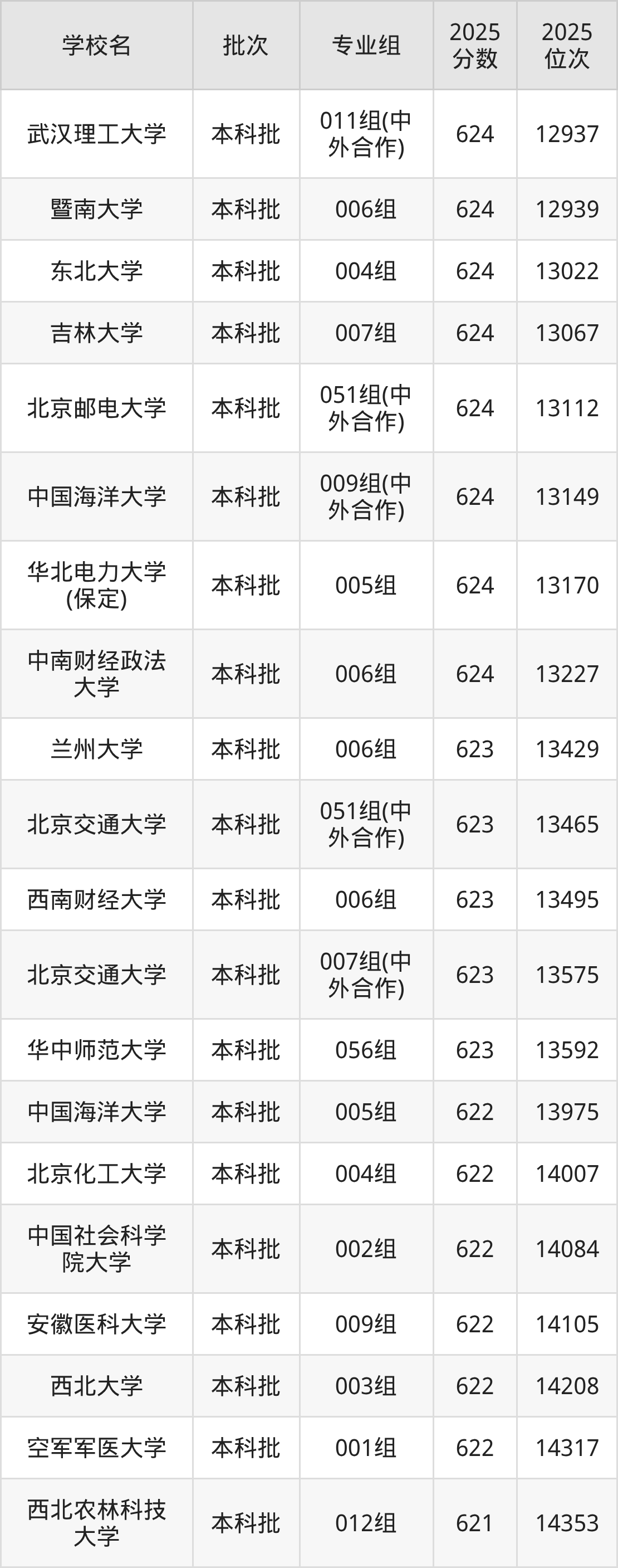 2025年安徽高考物理类623分(13375名~13859名)能上的大学有北京交通大学007组(中外合作)、北京交通大学051组(中外合作)、华中师范大学056组、兰州大学006组等。