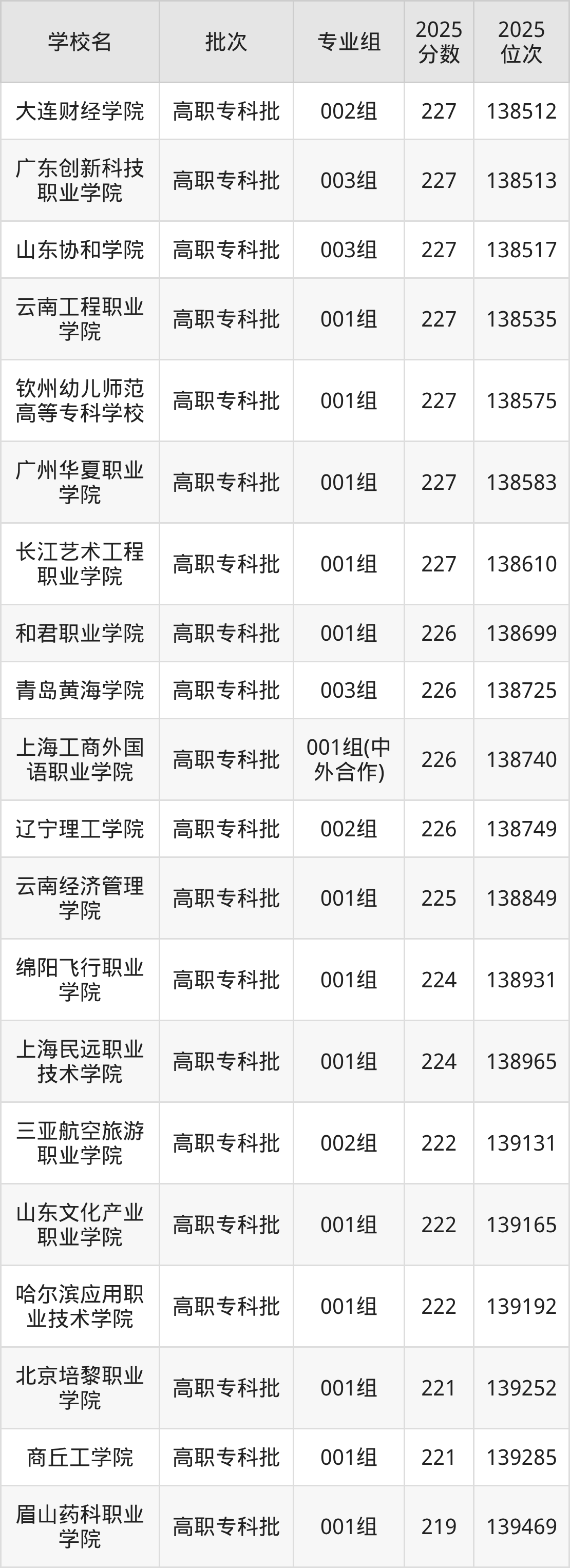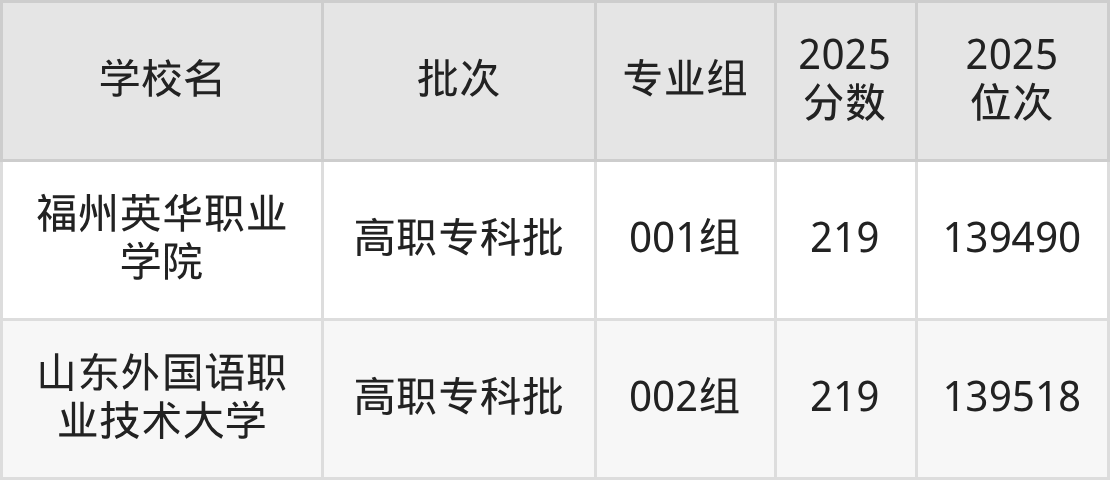 2025年安徽高考历史类223分(138984名~139119名)录取位次低于该区间(较稳妥)的有三亚航空旅游职业学院002组(139131名)、山东文化产业职业学院001组(139165名)等;录取位次高于该区间(可冲)的有上海民远职业技术学院001组(138965名)、绵阳飞行职业学院001组(138931名)等。
