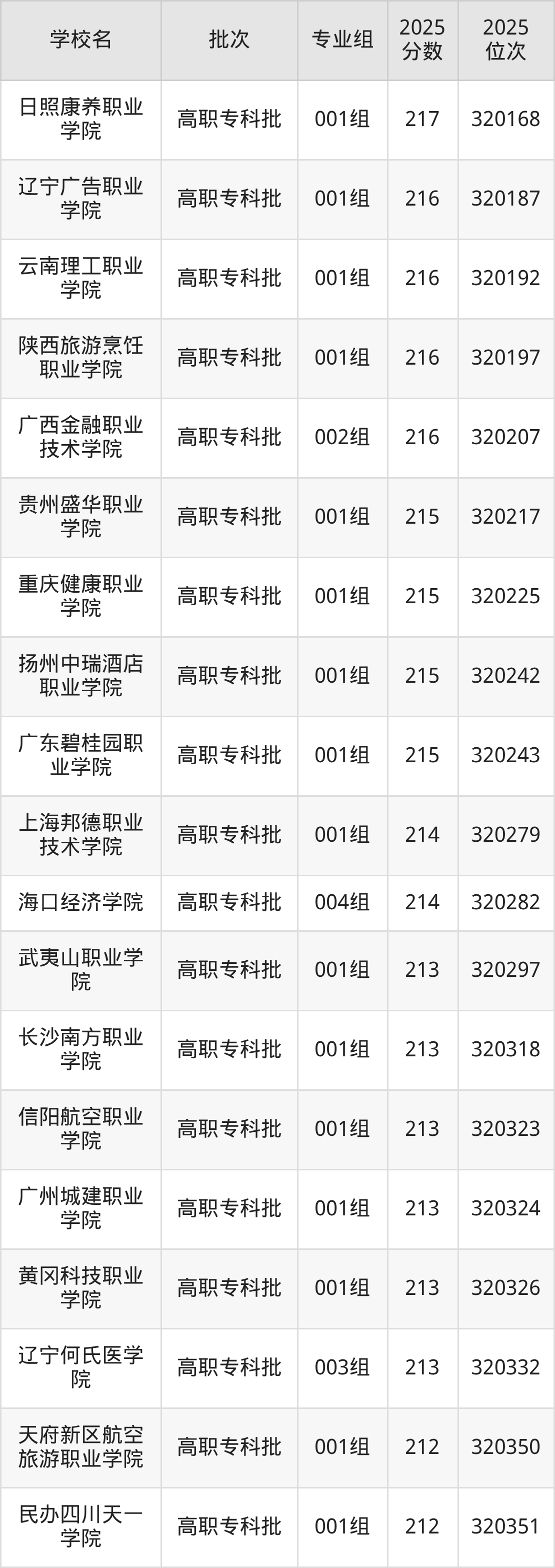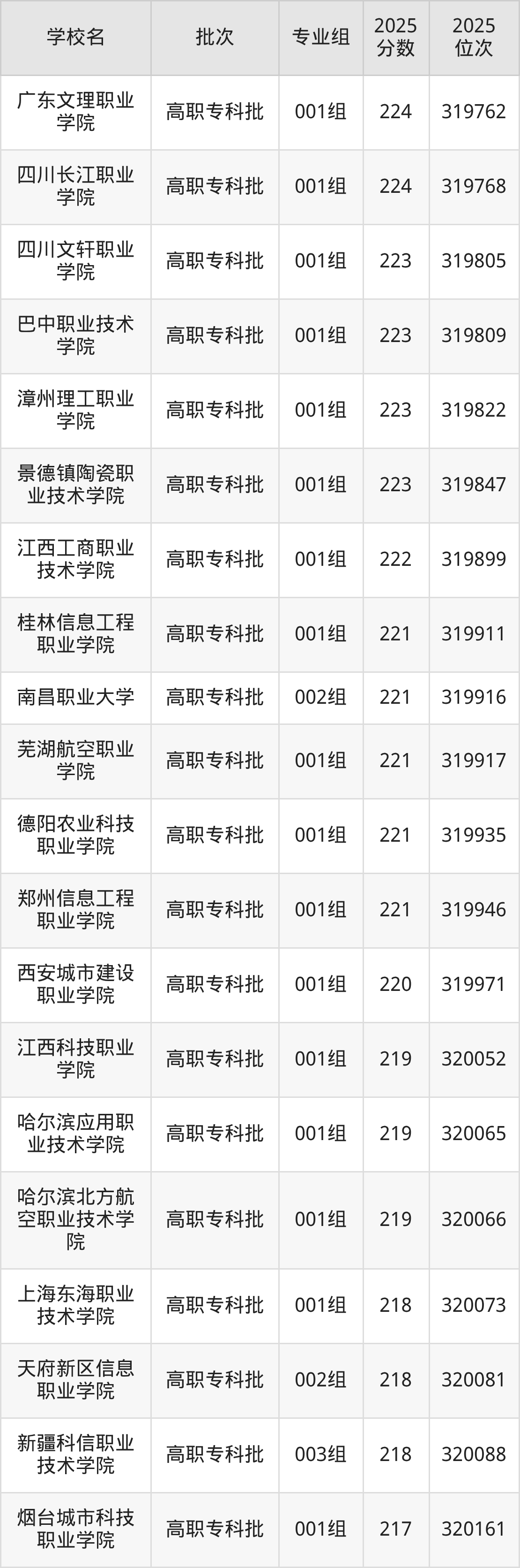 2025年安徽高考物理类223分(319797名~319854名)能上的大学有巴中职业技术学院001组、景德镇陶瓷职业技术学院001组、四川文轩职业学院001组、漳州理工职业学院001组。
