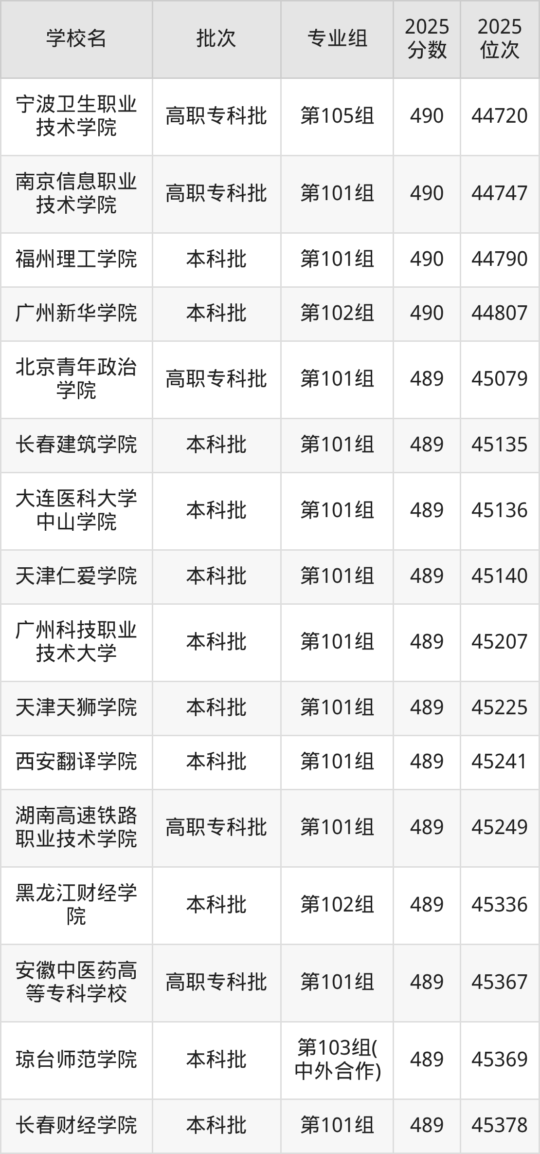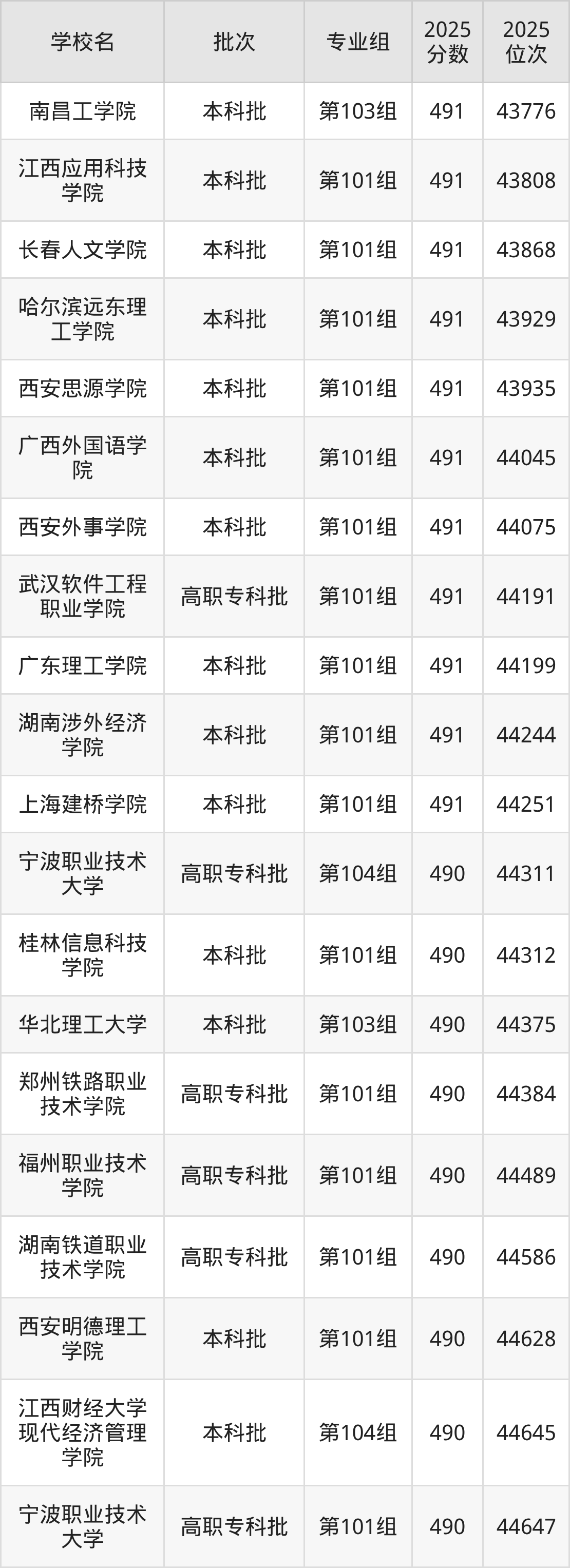 2025年江西高考历史类490分(44270名~44921名)能上的大学有华北理工大学第103组、广州新华学院第102组、桂林信息科技学院第101组、西安明德理工学院第101组等。