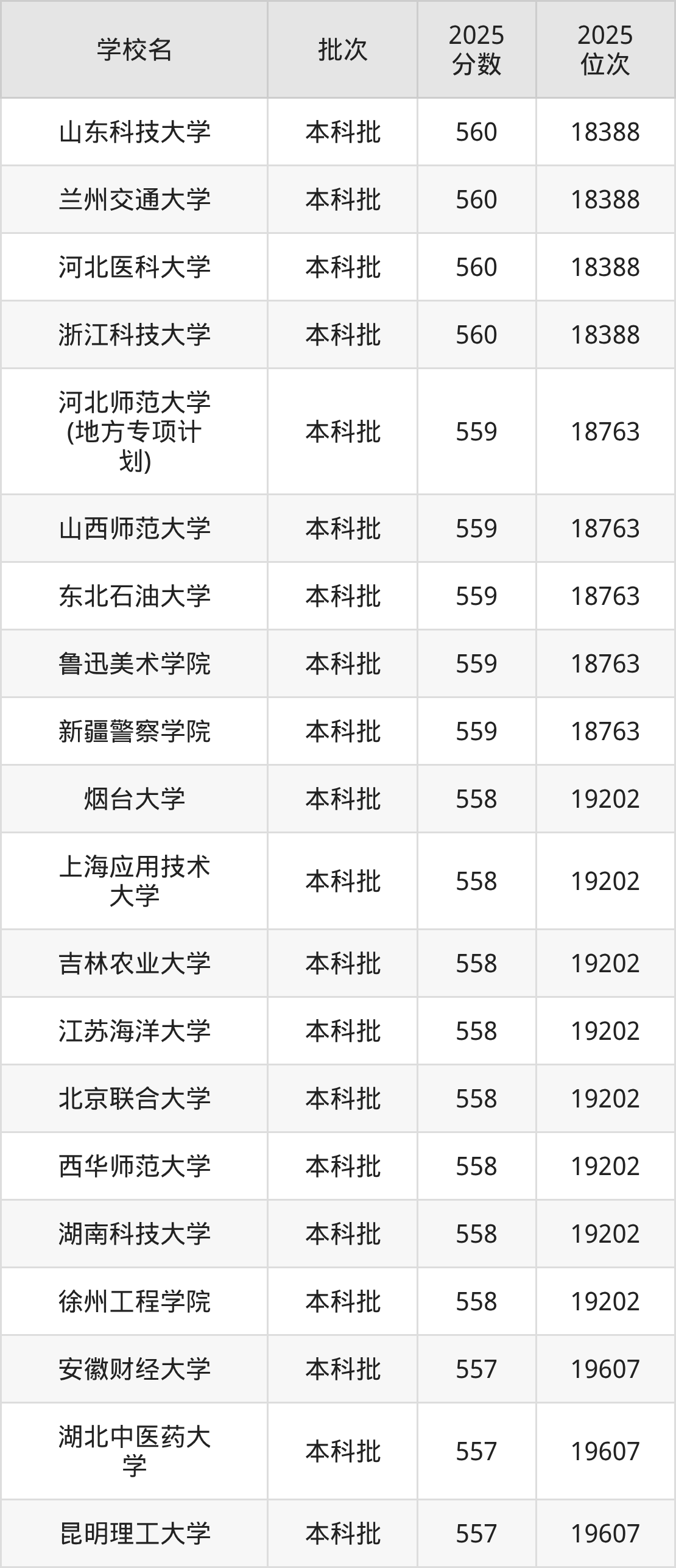2025年河北高考历史类558分(18764名~19202名)能上的大学有上海应用技术大学、徐州工程学院、湖南科技大学、西华师范大学等。
