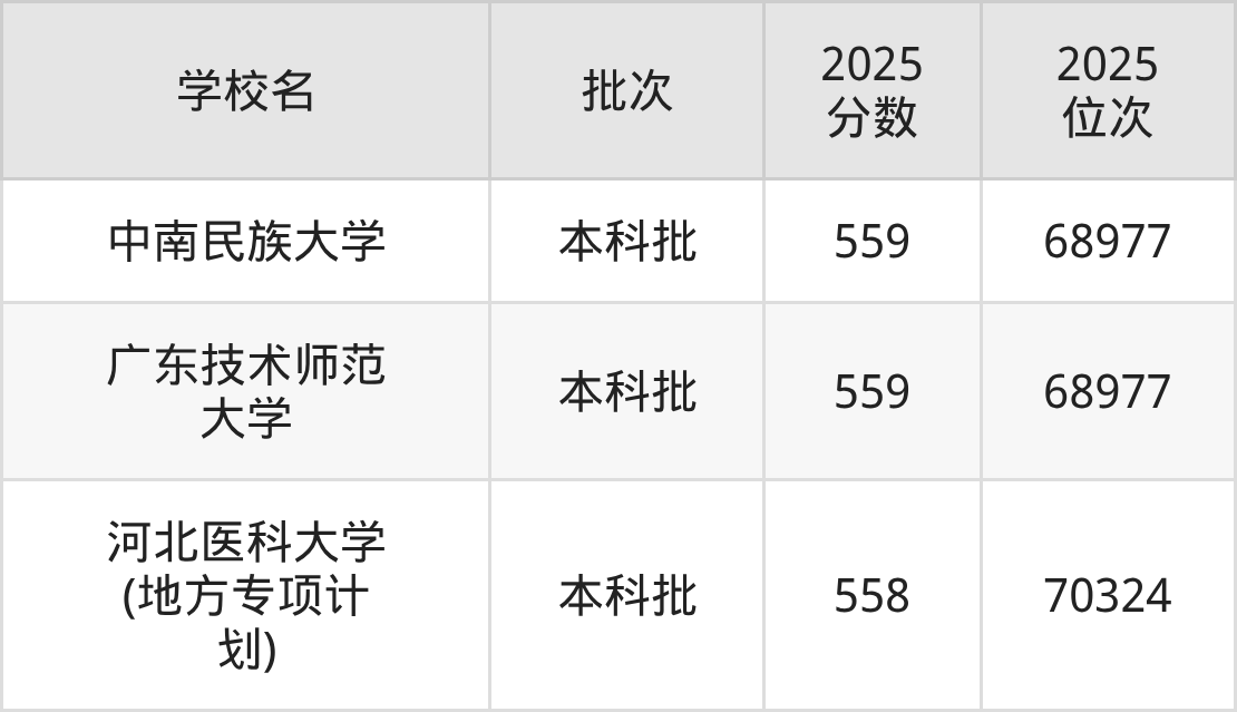 2025年河北高考物理类558分(68978名~70324名)能上的大学有河北医科大学(地方专项计划)。