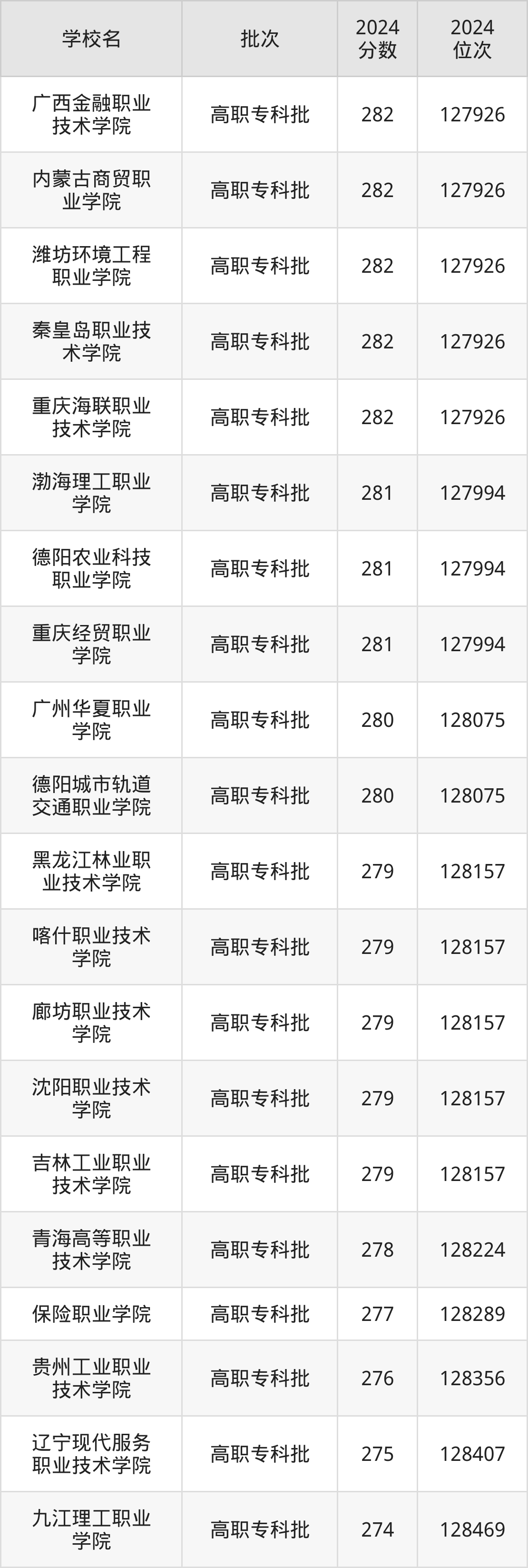 另外录取位次低于该区间(较稳妥)的有辽宁理工职业大学(166637名)、山西林业职业技术学院(166637名)等;录取位次高于该区间(可冲)的有湖北国土资源职业学院(166284名)、铁岭卫生职业学院(166284名)等。