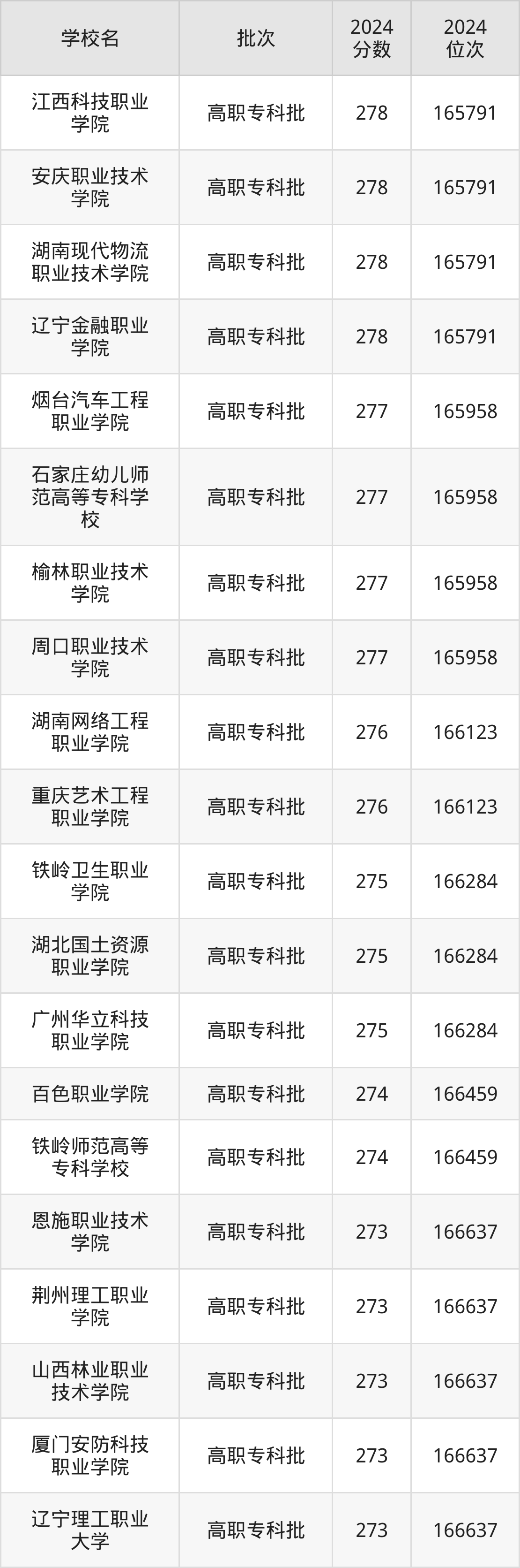 2024年云南高考理科274分(166285名~166459名)能上的大学有铁岭师范高等专科学校、百色职业学院。