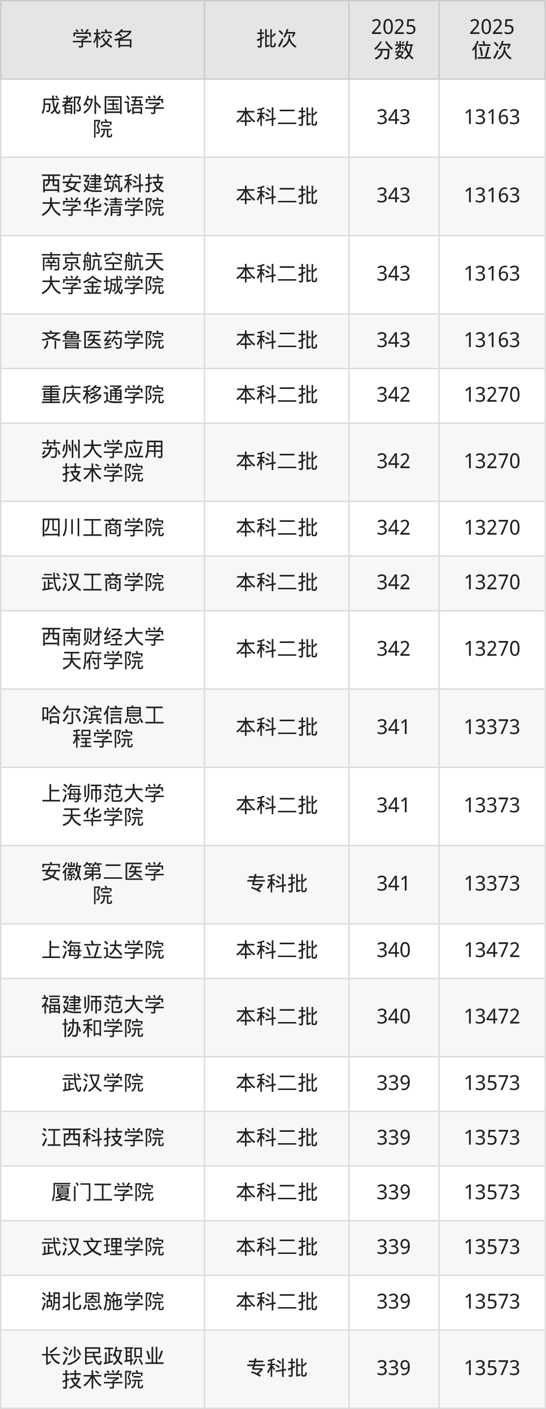 2025年新疆高考文科343分(13072名~13163名)能上的大学有齐鲁医药学院、南京航空航天大学金城学院、成都外国语学院、西安建筑科技大学华清学院。