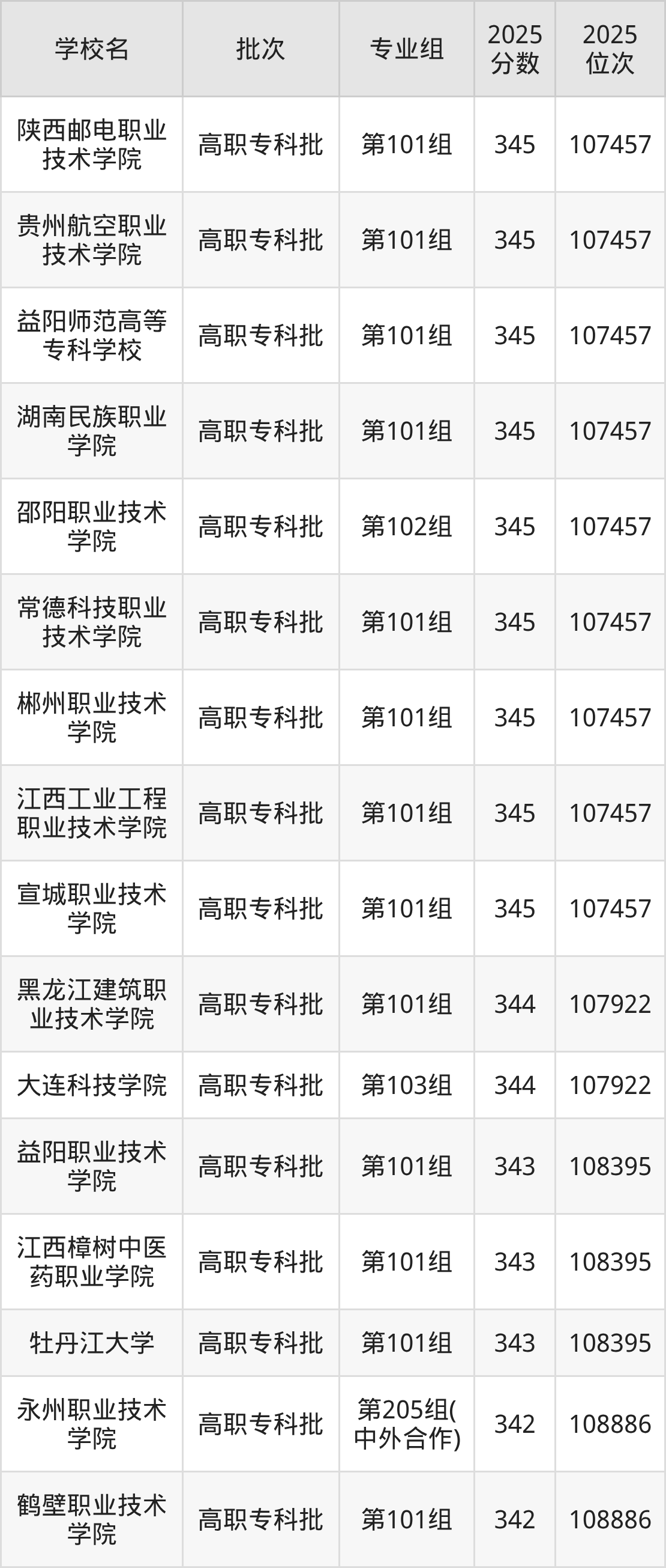 2025年湖南高考历史类343分(107923名~108395名)能上的大学有牡丹江大学第101组、江西樟树中医药职业学院第101组、益阳职业技术学院第101组。