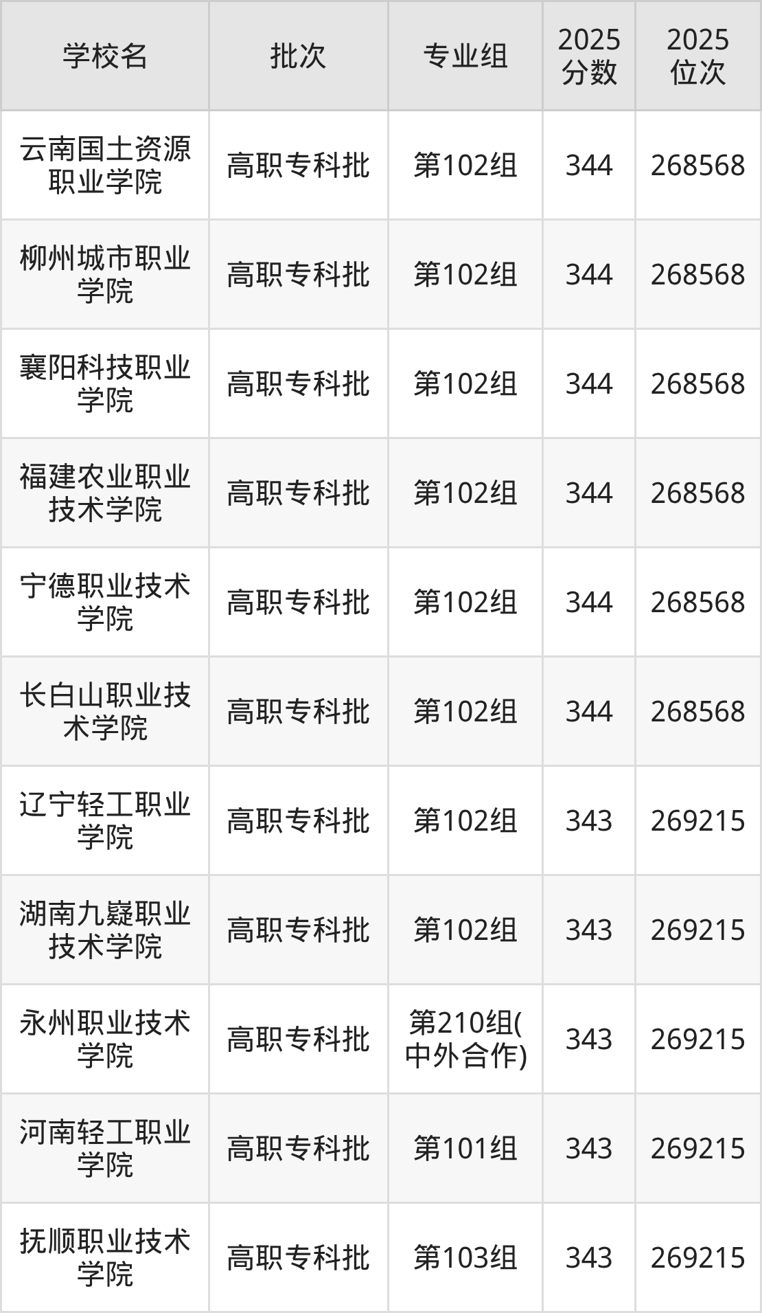 2025年湖南高考物理类343分(268569名~269215名)能上的大学有辽宁轻工职业学院第102组、抚顺职业技术学院第103组、河南轻工职业学院第101组、永州职业技术学院第210组(中外合作)等。