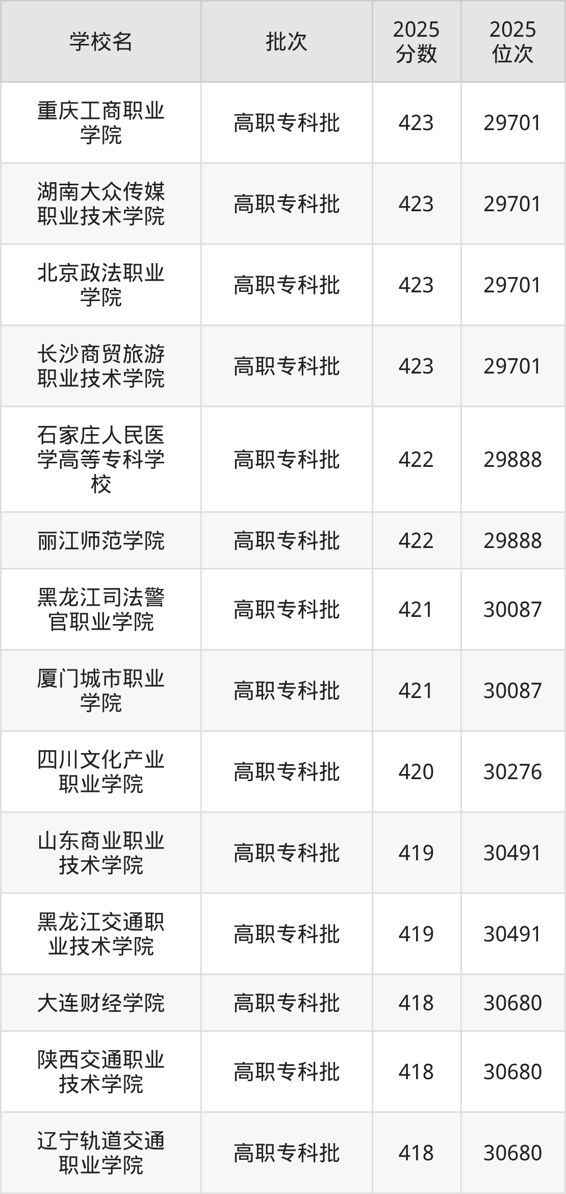 另外录取位次低于该区间(较稳妥)的有黑龙江交通职业技术学院(30491名)、山东商业职业技术学院(30491名)等;录取位次高于该区间(可冲)的有黑龙江司法警官职业学院(30087名)、厦门城市职业学院(30087名)等。