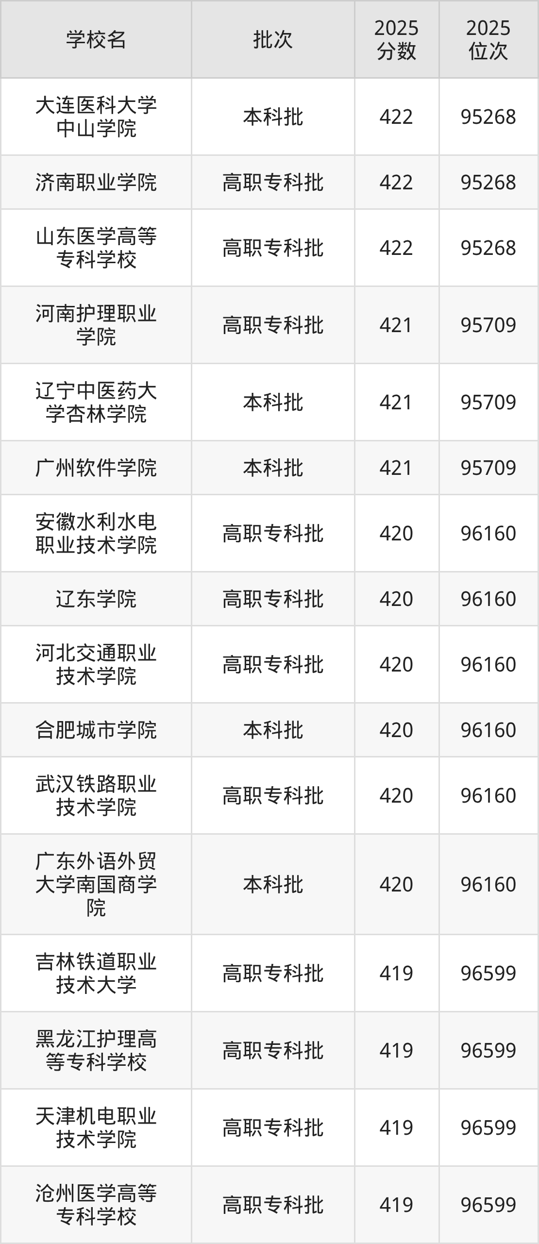 2025年辽宁高考物理类420分(95710名~96160名)能上的大学有河北交通职业技术学院、安徽水利水电职业技术学院、辽东学院、合肥城市学院等。