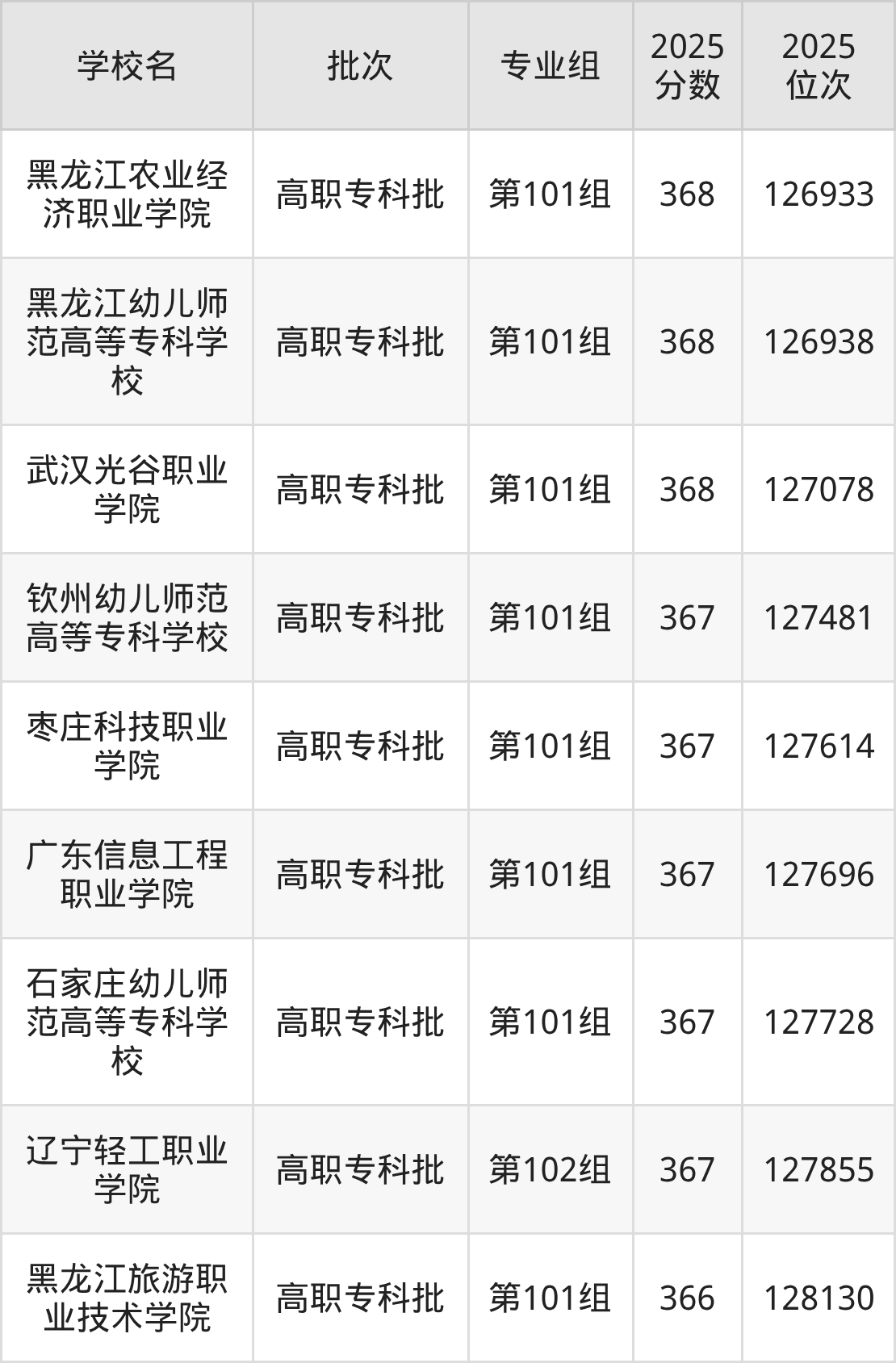 2025年江西高考历史类367分(127301名~128062名)能上的大学有钦州幼儿师范高等专科学校第101组、辽宁轻工职业学院第102组、枣庄科技职业学院第101组、广东信息工程职业学院第101组等。
