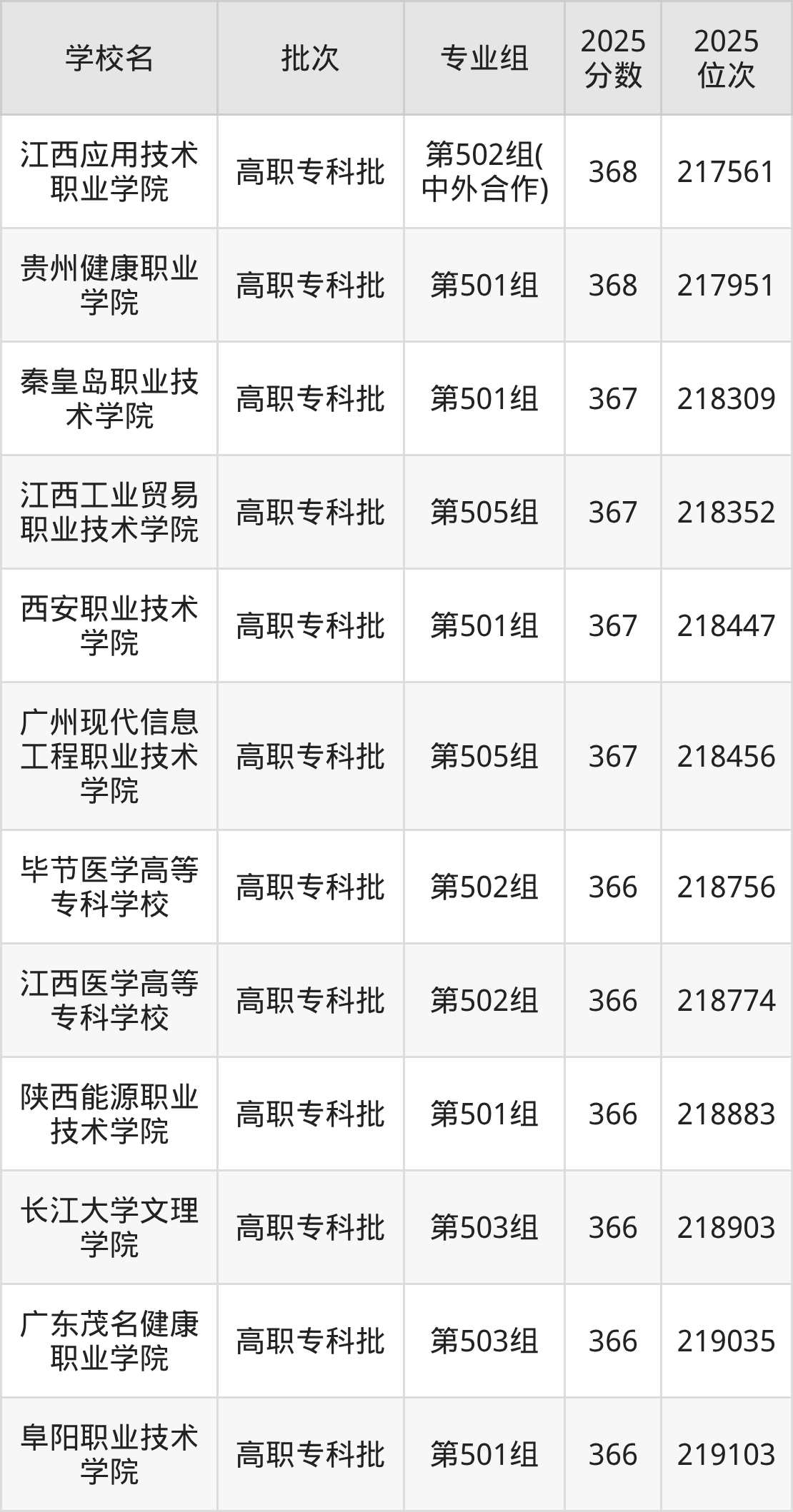 另外录取位次低于该区间(较稳妥)的有毕节医学高等专科学校第502组(218756名)、江西医学高等专科学校第502组(218774名)等;录取位次高于该区间(可冲)的有贵州健康职业学院第501组(217951名)、江西应用技术职业学院第502组(中外合作)(217561名)等。