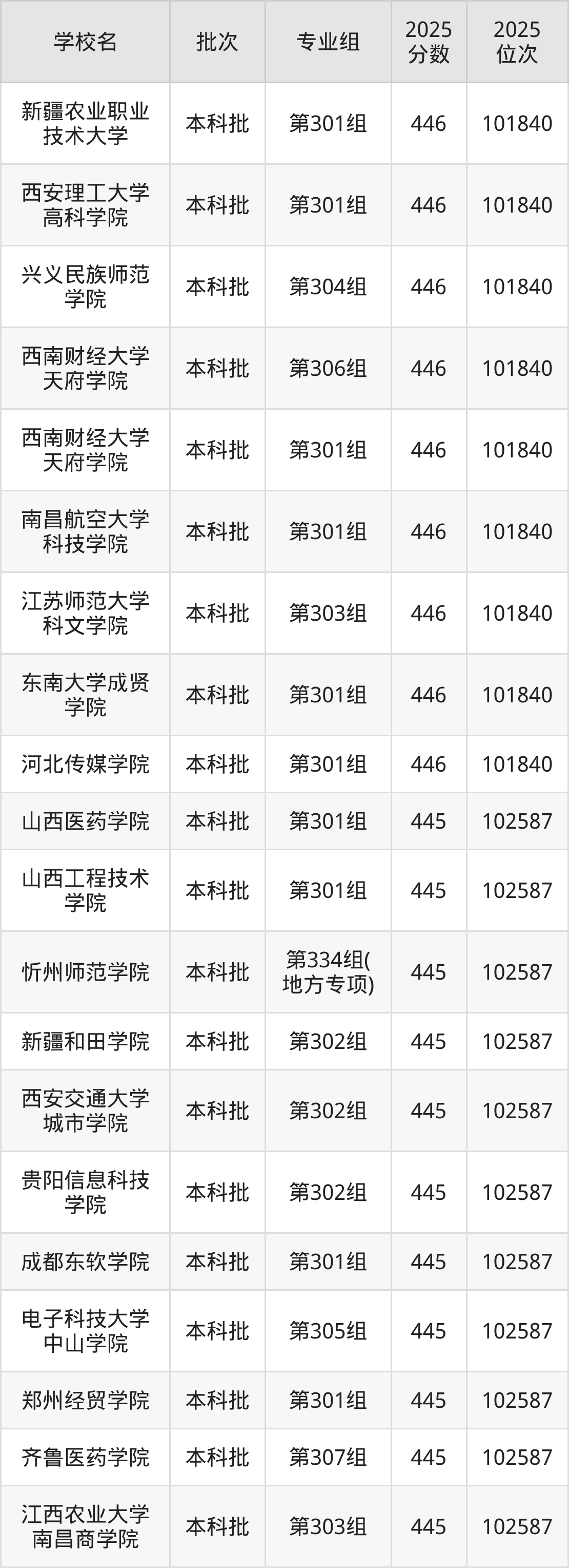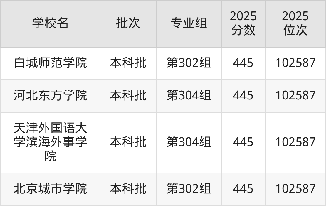 2025年山西高考物理类445分(101841名~102587名)能上的大学有北京城市学院第302组、天津外国语大学滨海外事学院第304组、河北东方学院第304组、白城师范学院第302组等。