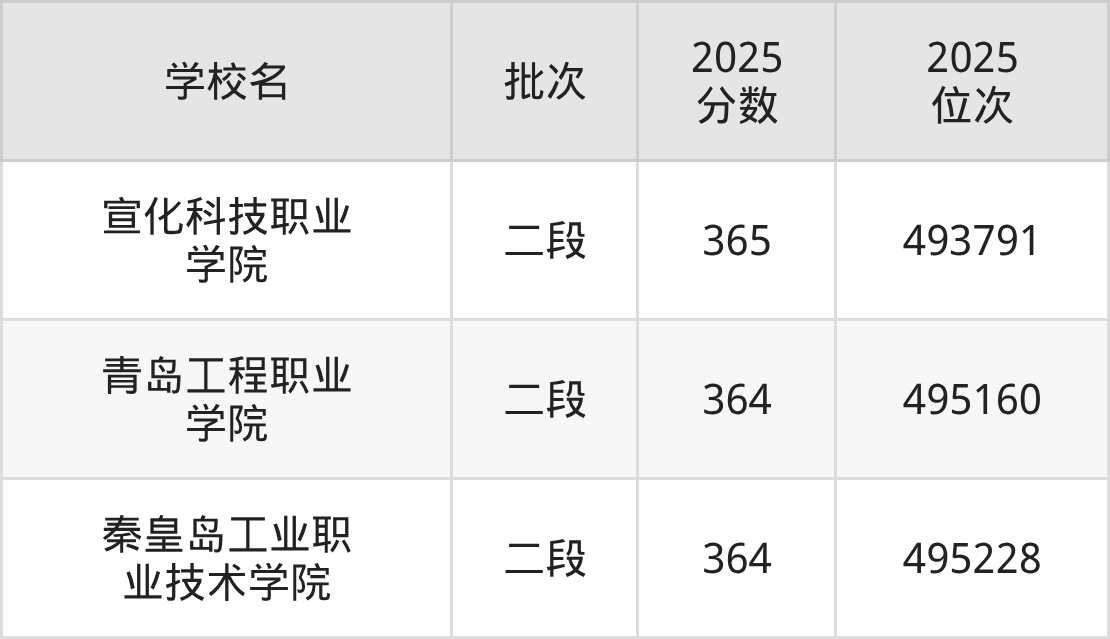 2025年山东高考364分(493900名~495731名)能上的大学有青岛工程职业学院、秦皇岛工业职业技术学院。