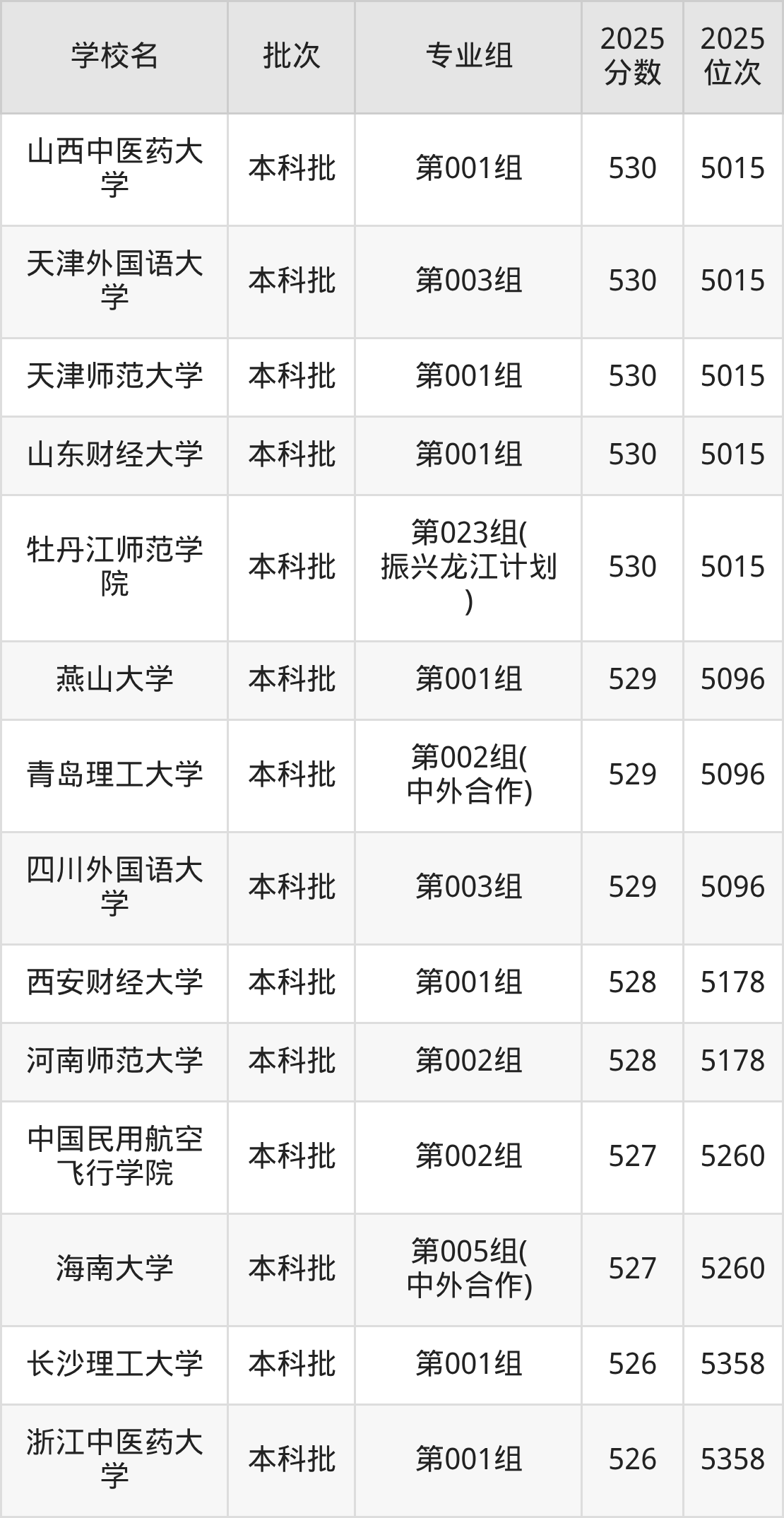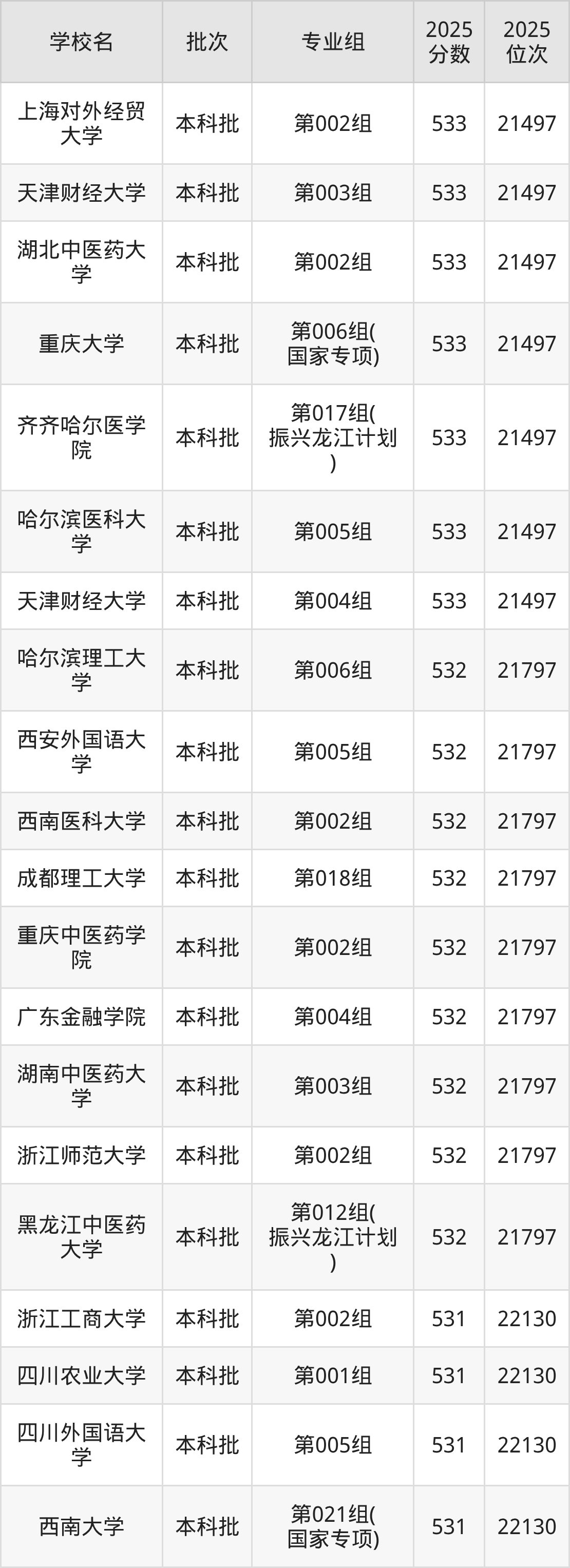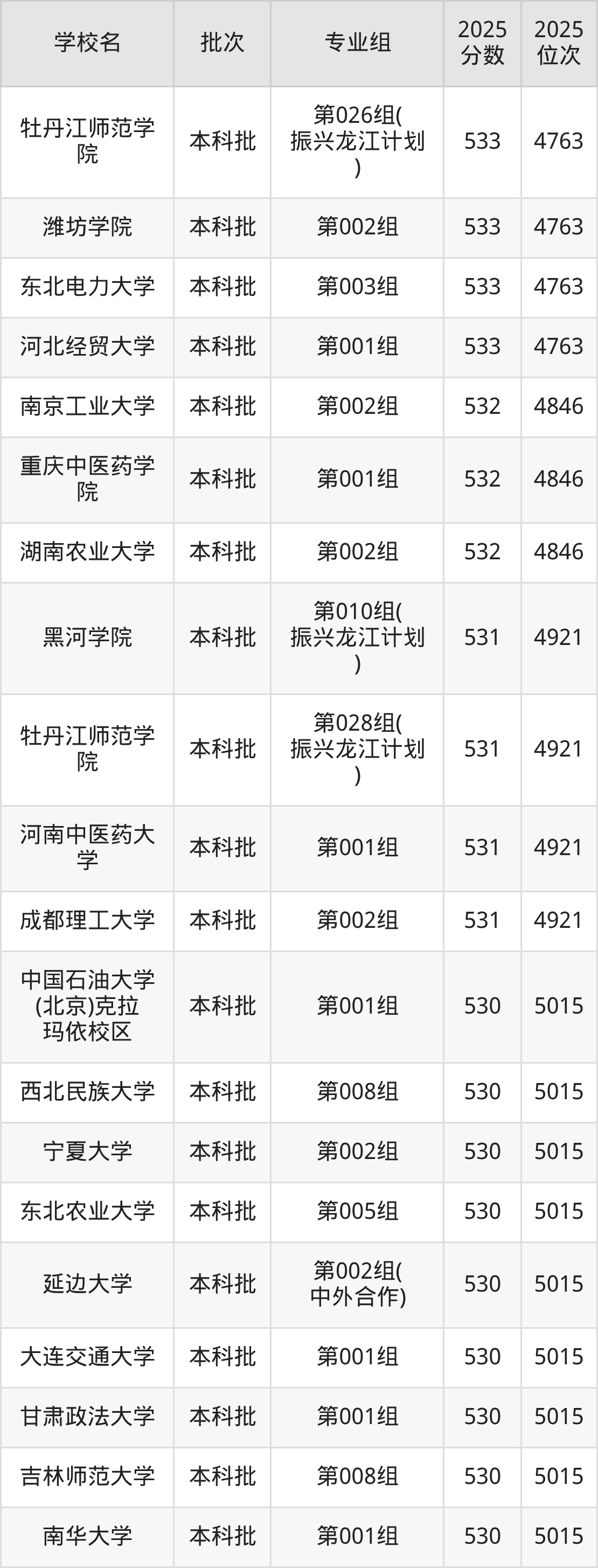 2025年黑龙江高考历史类531分(4847名~4921名)能上的大学有牡丹江师范学院第028组(振兴龙江计划)、黑河学院第010组(振兴龙江计划)、河南中医药大学第001组、成都理工大学第002组。
