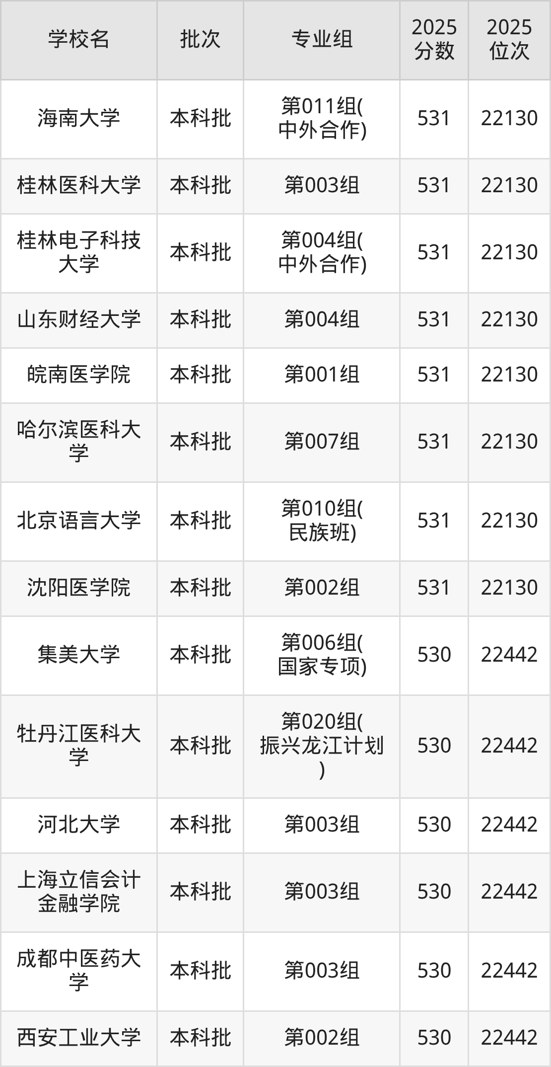 2025年黑龙江高考物理类531分(21798名~22130名)能上的大学有北京语言大学第010组(民族班)、沈阳医学院第002组、哈尔滨医科大学第007组、浙江工商大学第002组等。