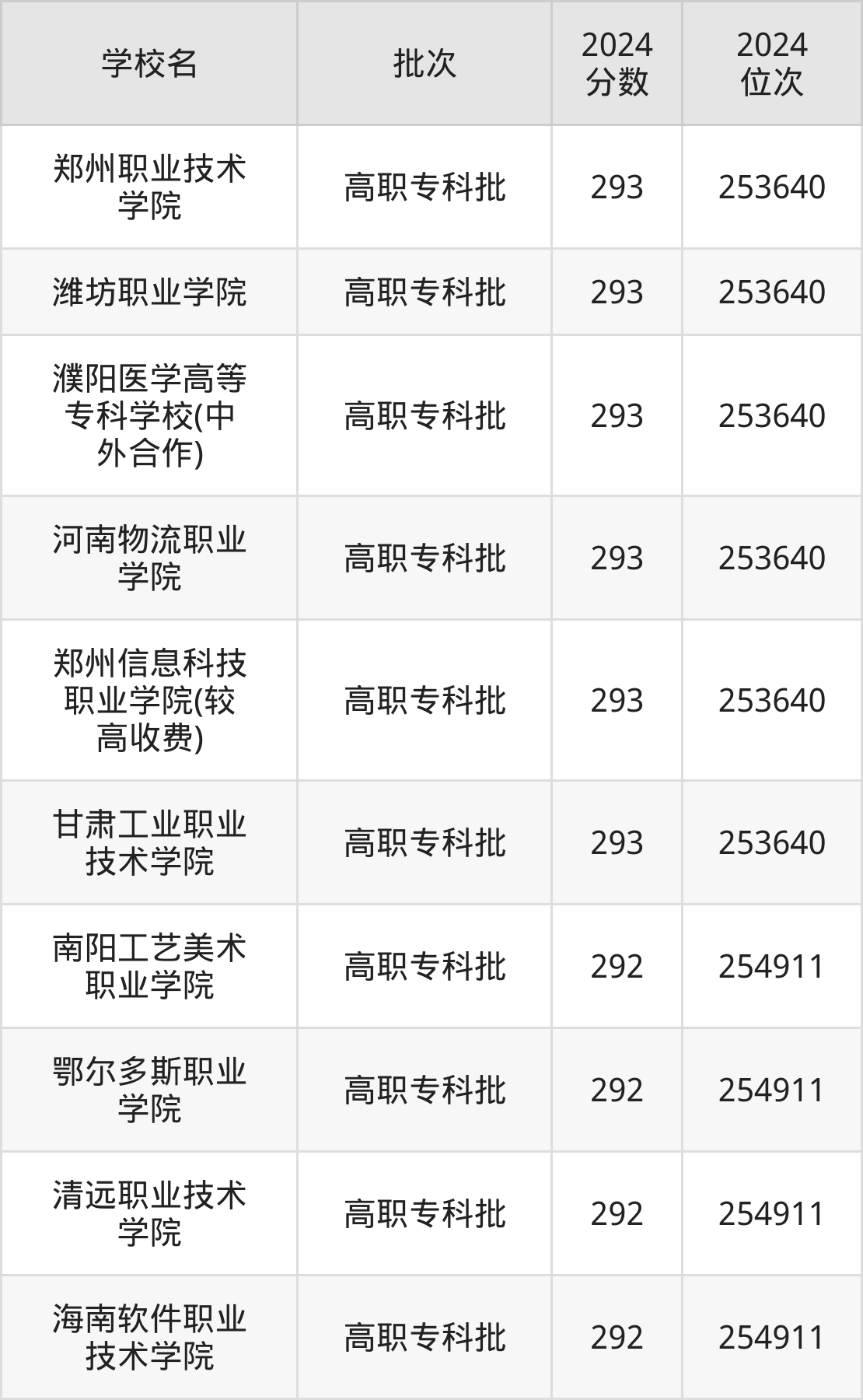 另外录取位次低于该区间(较稳妥)的有北京科技职业学院(256092名)、吉林电子信息职业技术学院(256092名)等;录取位次高于该区间(可冲)的有河南物流职业学院(253640名)、濮阳医学高等专科学校(中外合作)(253640名)等。
