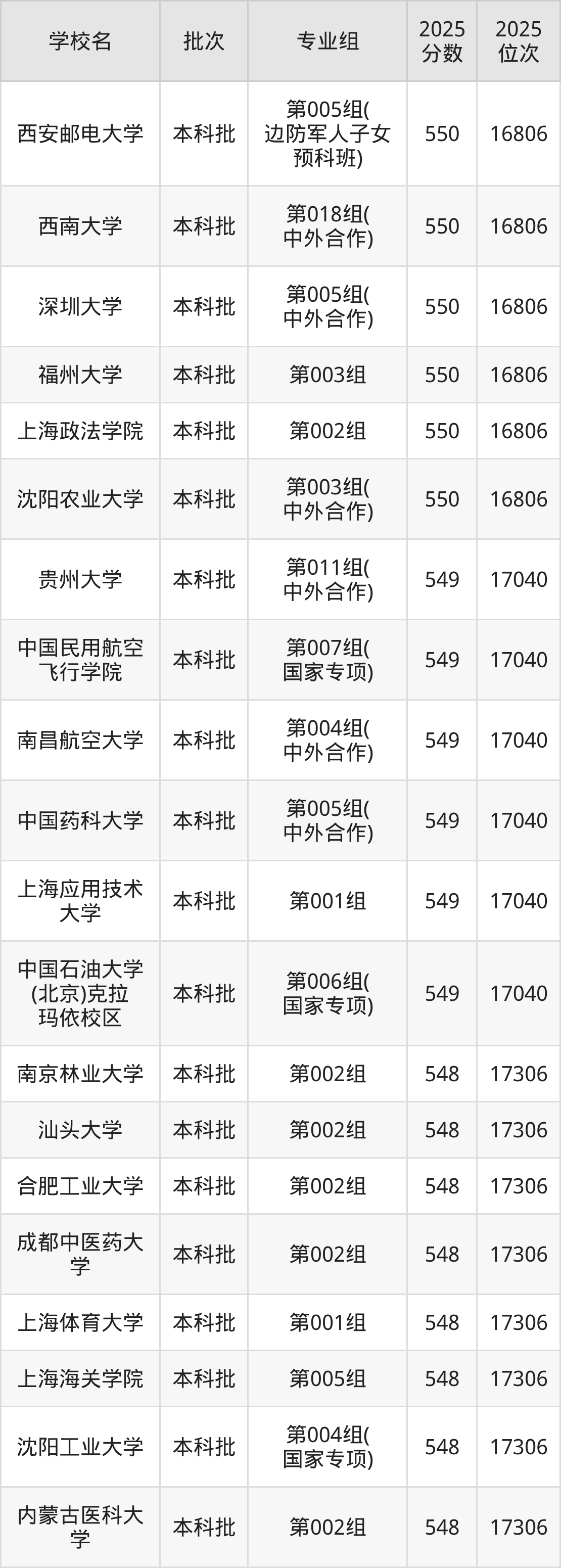 另外录取位次低于该区间(较稳妥)的有吉林大学第011组(17836名)、西华大学第004组(17836名)等;录取位次高于该区间(可冲)的有内蒙古医科大学第002组(17306名)、沈阳工业大学第004组(国家专项)(17306名)等。