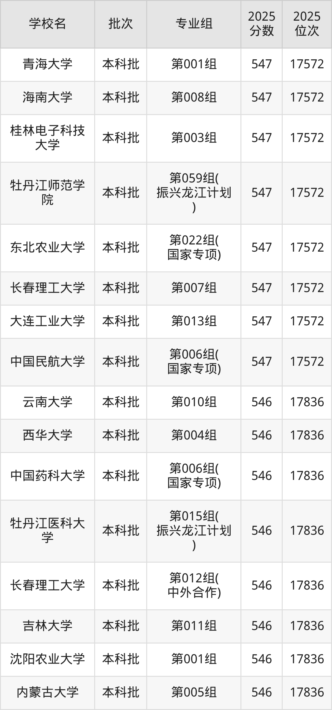 2025年黑龙江高考物理类547分(17307名~17572名)能上的大学有中国民航大学第006组(国家专项)、大连工业大学第013组、长春理工大学第007组、东北农业大学第022组(国家专项)等。