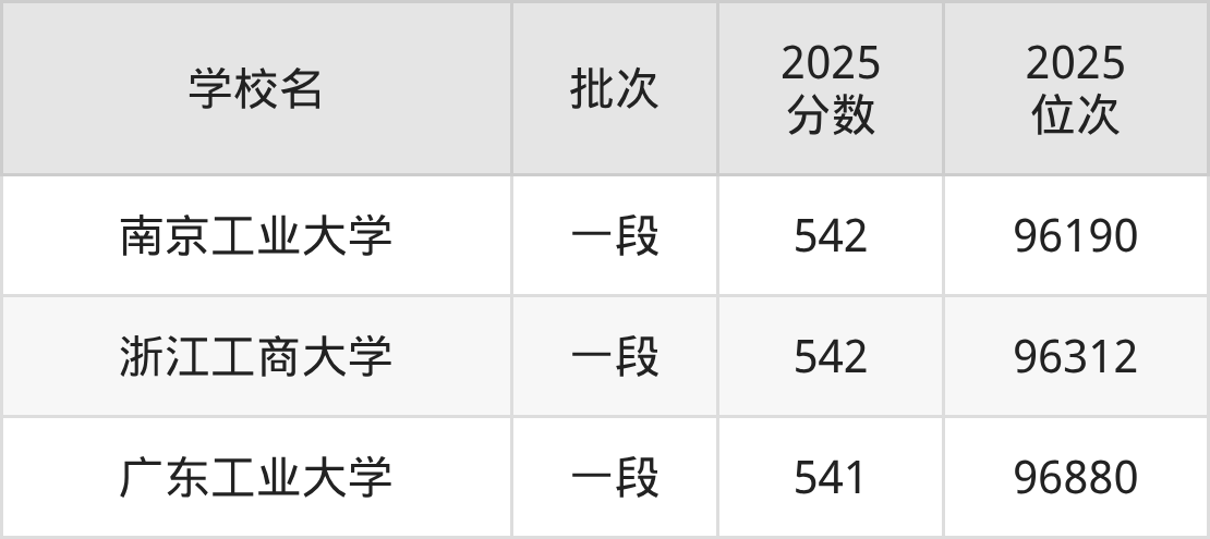 2025年山东高考542分(94982名~96810名)能上的大学有南京工业大学、浙江工商大学。