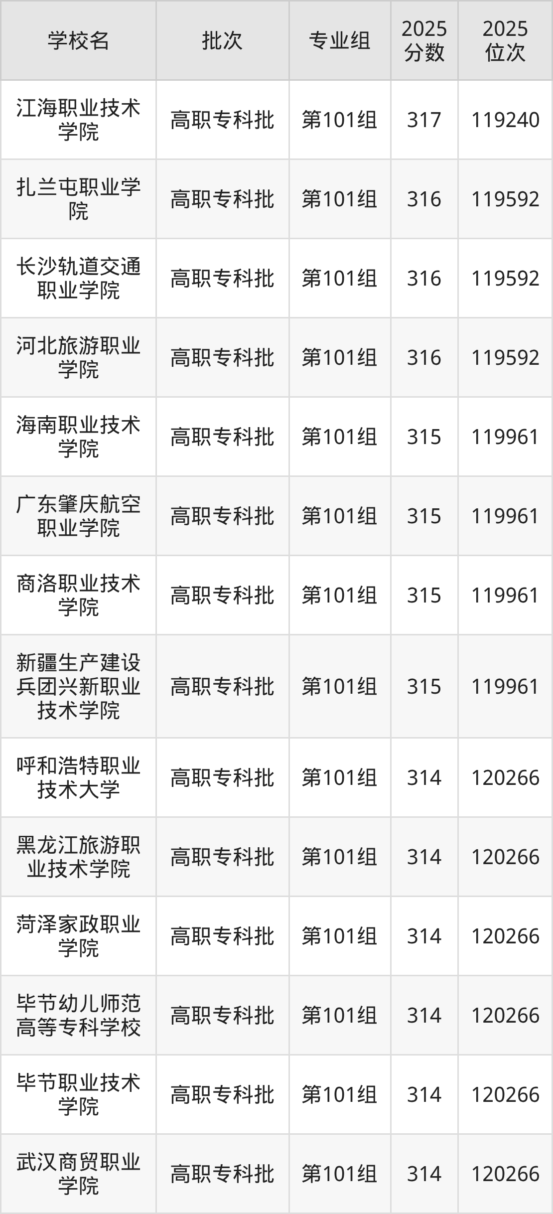 另外录取位次低于该区间(较稳妥)的有菏泽家政职业学院第101组(120266名)、毕节职业技术学院第101组(120266名)等;录取位次高于该区间(可冲)的有河北旅游职业学院第101组(119592名)、扎兰屯职业学院第101组(119592名)等。