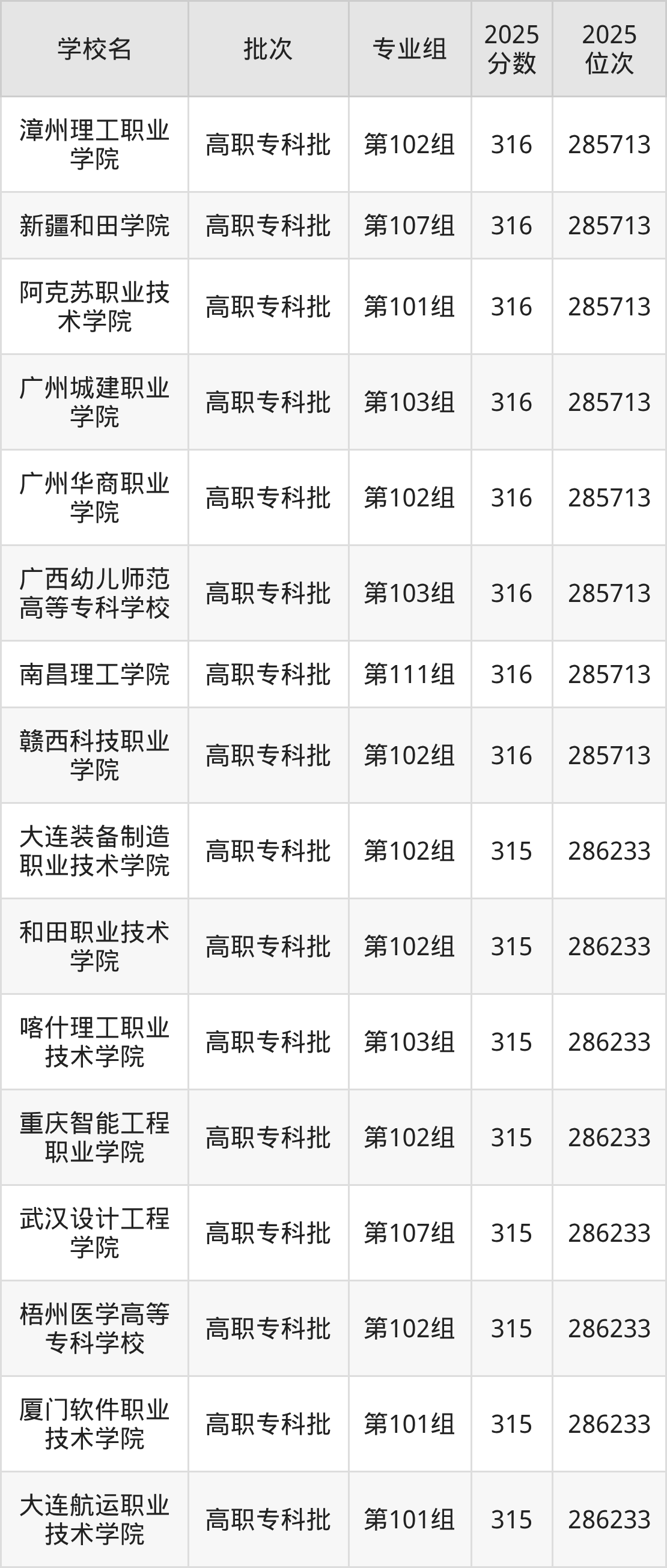 2025年湖南高考物理类315分(285714名~286233名)能上的大学有大连航运职业技术学院第101组、大连装备制造职业技术学院第102组、厦门软件职业技术学院第101组、梧州医学高等专科学校第102组等。