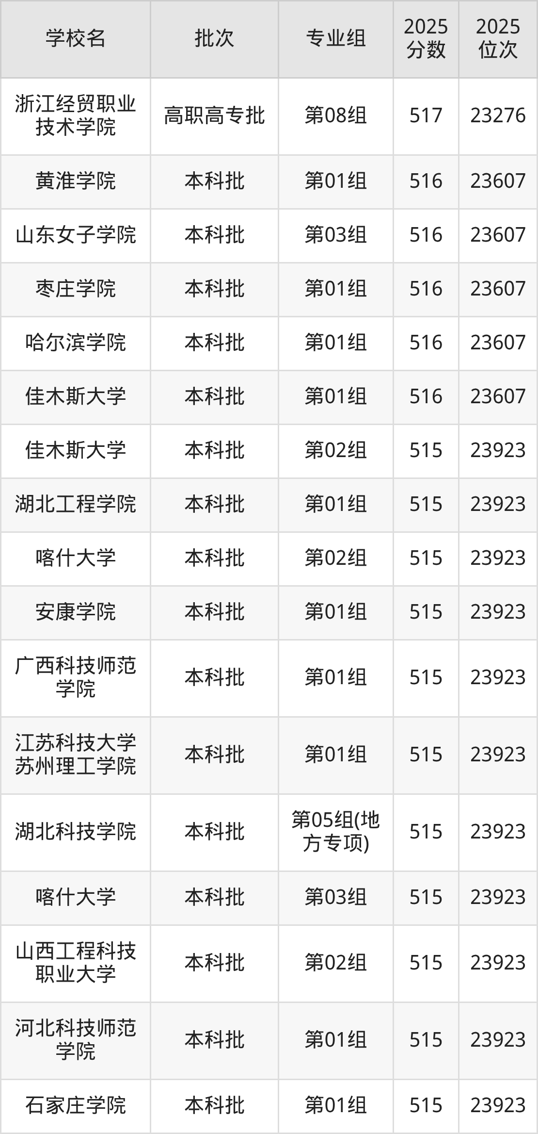 2025年湖北高考历史类516分(23277名~23607名)能上的大学有佳木斯大学第01组、哈尔滨学院第01组、枣庄学院第01组、山东女子学院第03组等。