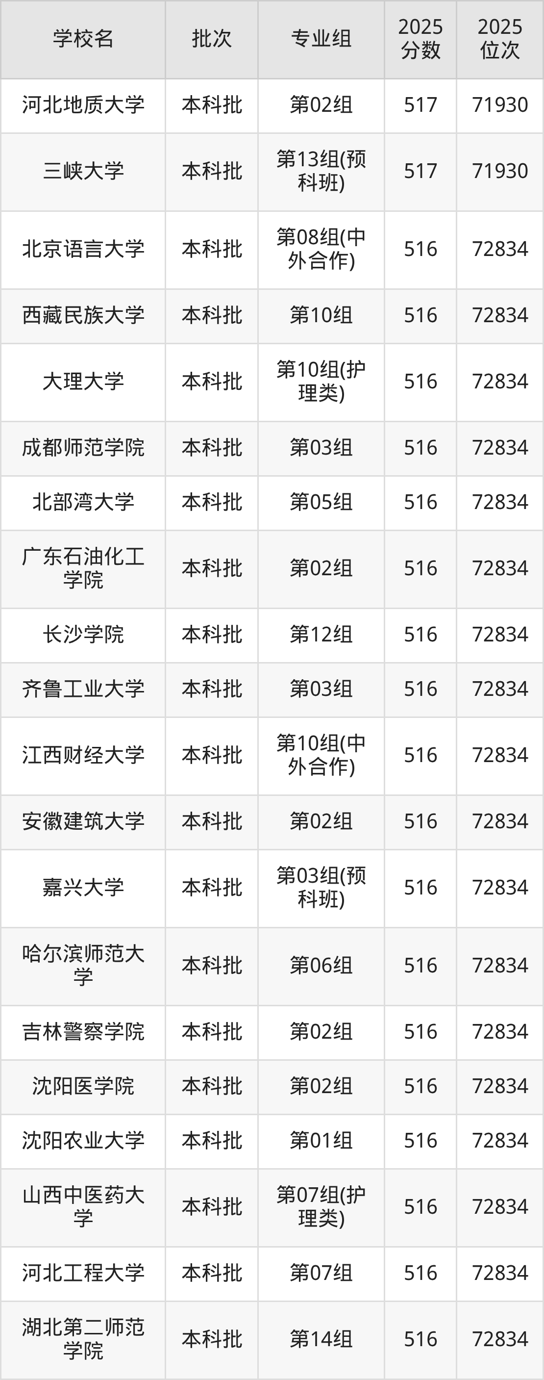2025年湖北高考物理类516分(71931名~72834名)能上的大学有北京语言大学第08组(中外合作)、湖北师范大学第07组、湖北第二师范学院第14组、河北工程大学第07组等。