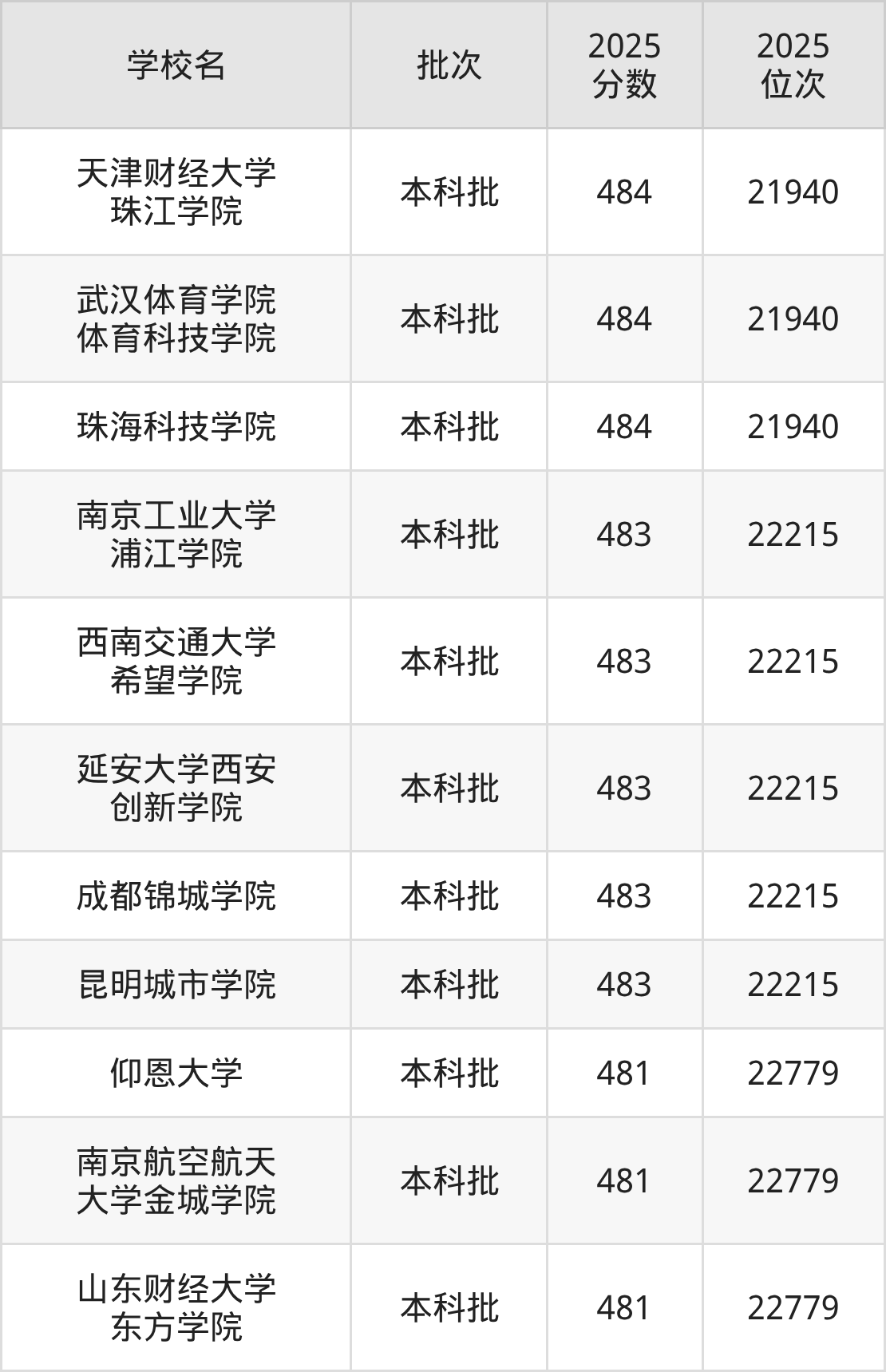 2025年重庆高考历史类482分(22216名~22503名)录取位次低于该区间(较稳妥)的有南京航空航天大学金城学院(22779名)、山东财经大学东方学院(22779名)等;录取位次高于该区间(可冲)的有西南交通大学希望学院(22215名)、昆明城市学院(22215名)等。