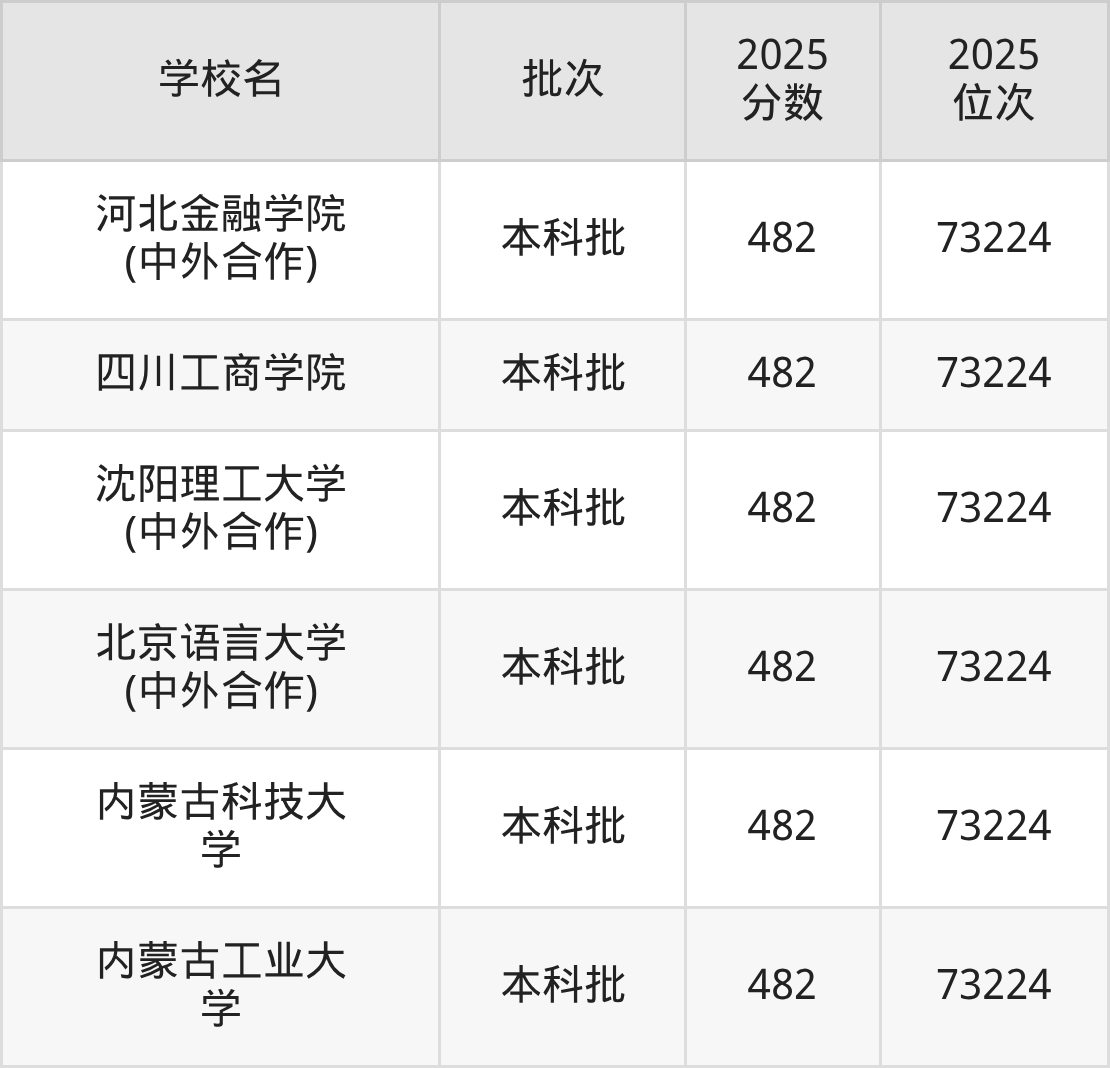 2025年重庆高考物理类482分(72626名~73224名)能上的大学有北京语言大学(中外合作)、沈阳理工大学(中外合作)、郑州工商学院、江西师范大学科学技术学院等。
