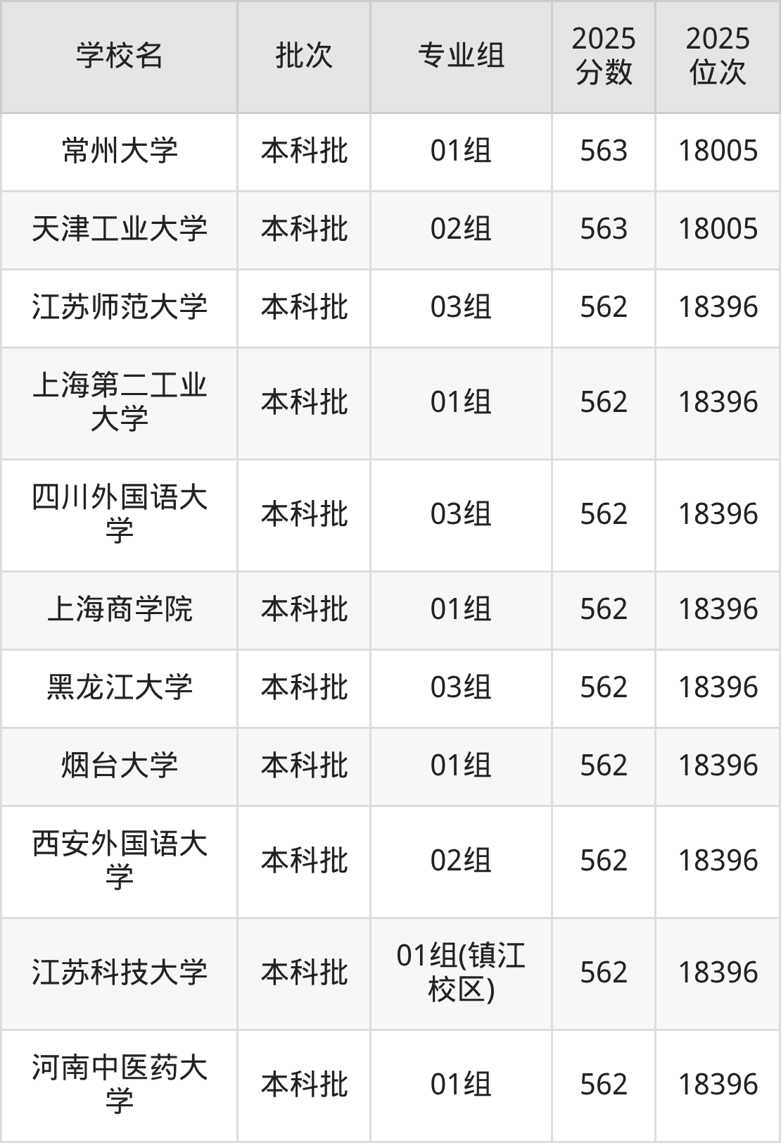 2025年江苏高考历史类563分(17575名~18005名)能上的大学有江苏第二师范学院03组、常州大学01组、常州大学02组、天津工业大学02组等。