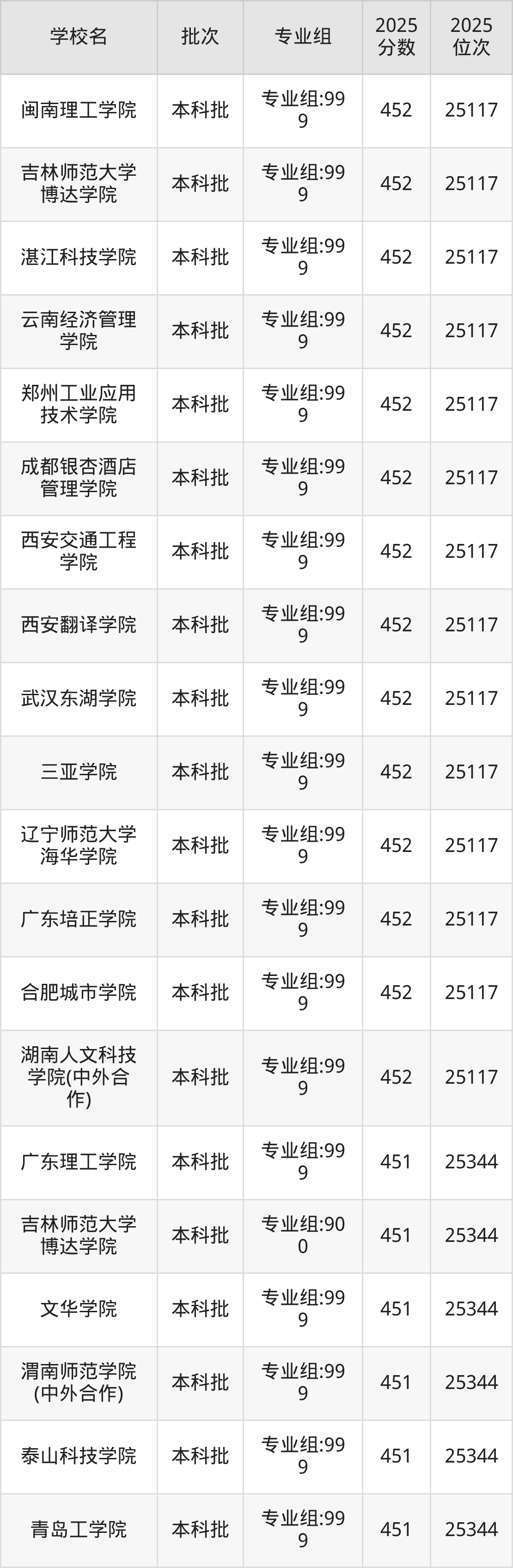 2025年福建高考物理类451分(110008名~110888名)能上的大学有桂林信息科技学院专业组:999、昆明文理学院专业组:999、西安建筑科技大学(中外合作)专业组:999。