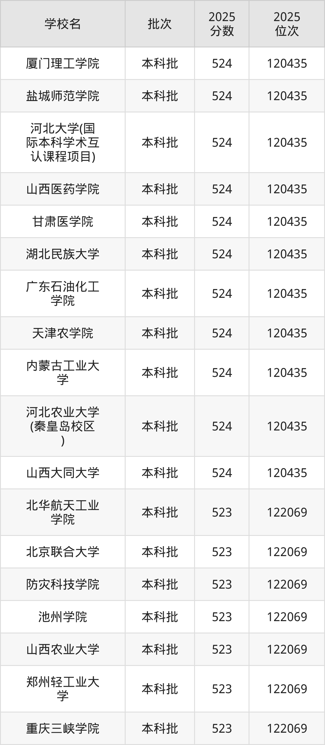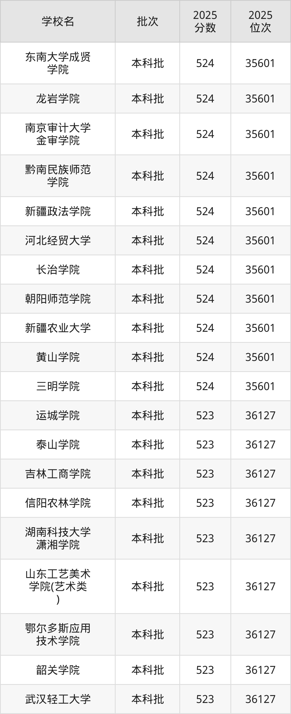 2025年河北高考历史类523分(35602名~36127名)能上的大学有泰山学院、山东工艺美术学院(艺术类)、吉林工商学院、信阳农林学院等。
