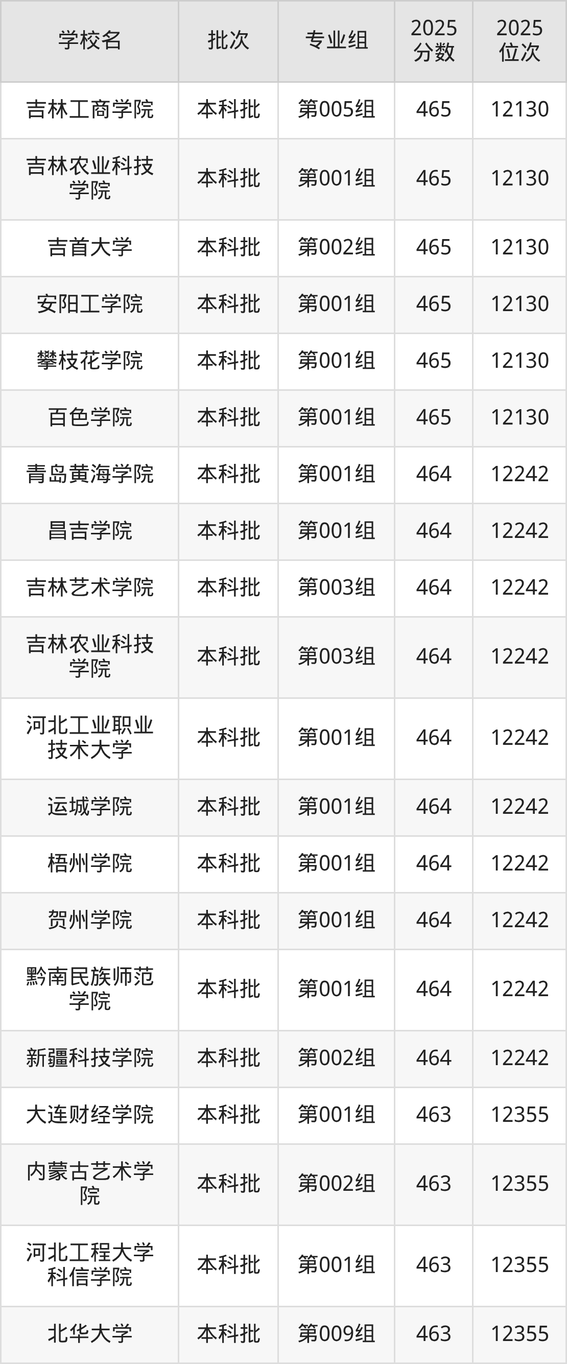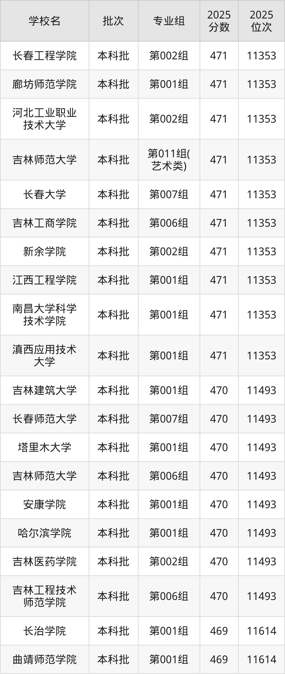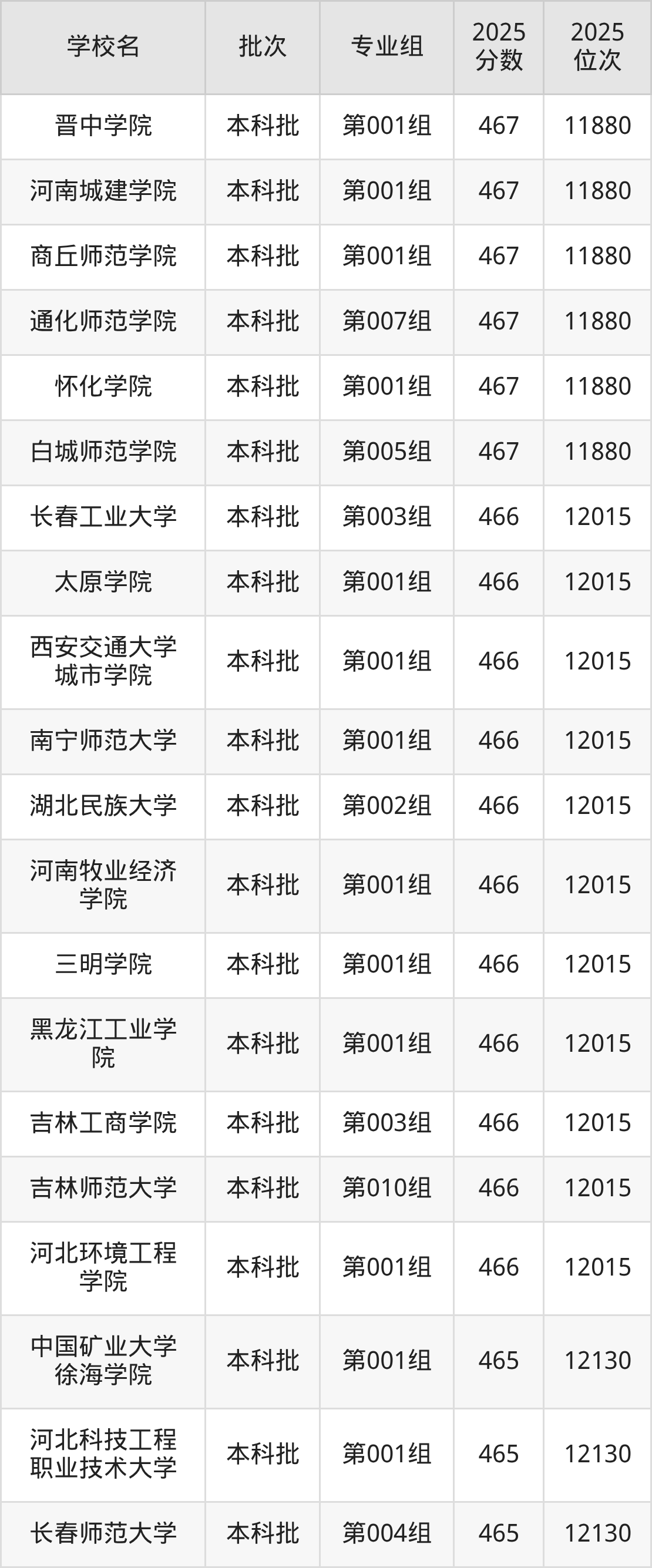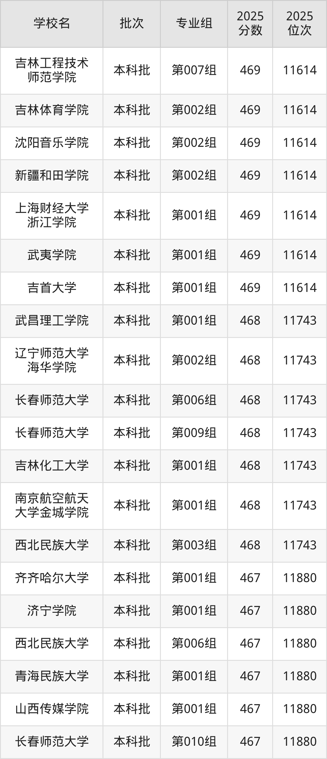 2025年吉林高考历史类467分(11744名~11880名)能上的大学有晋中学院第001组、山西传媒学院第001组、长春师范大学第010组、通化师范学院第007组等。