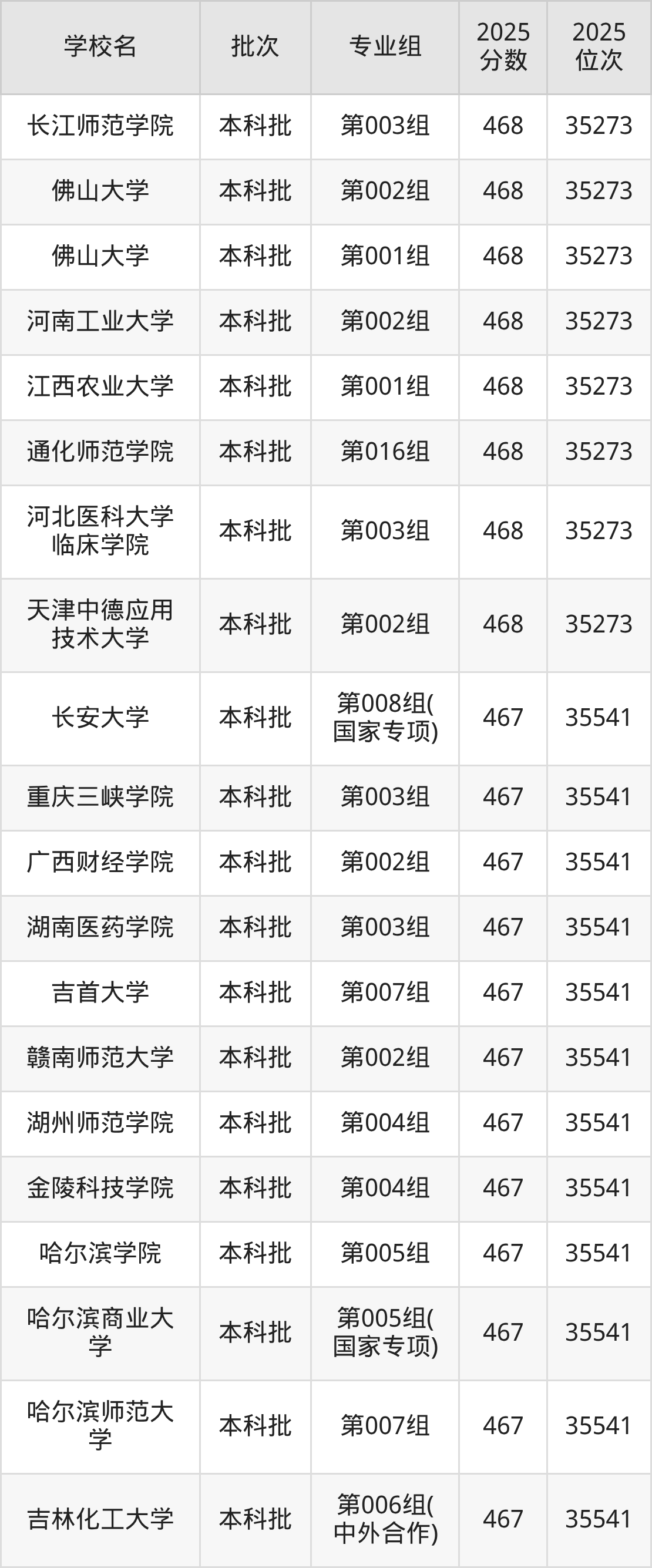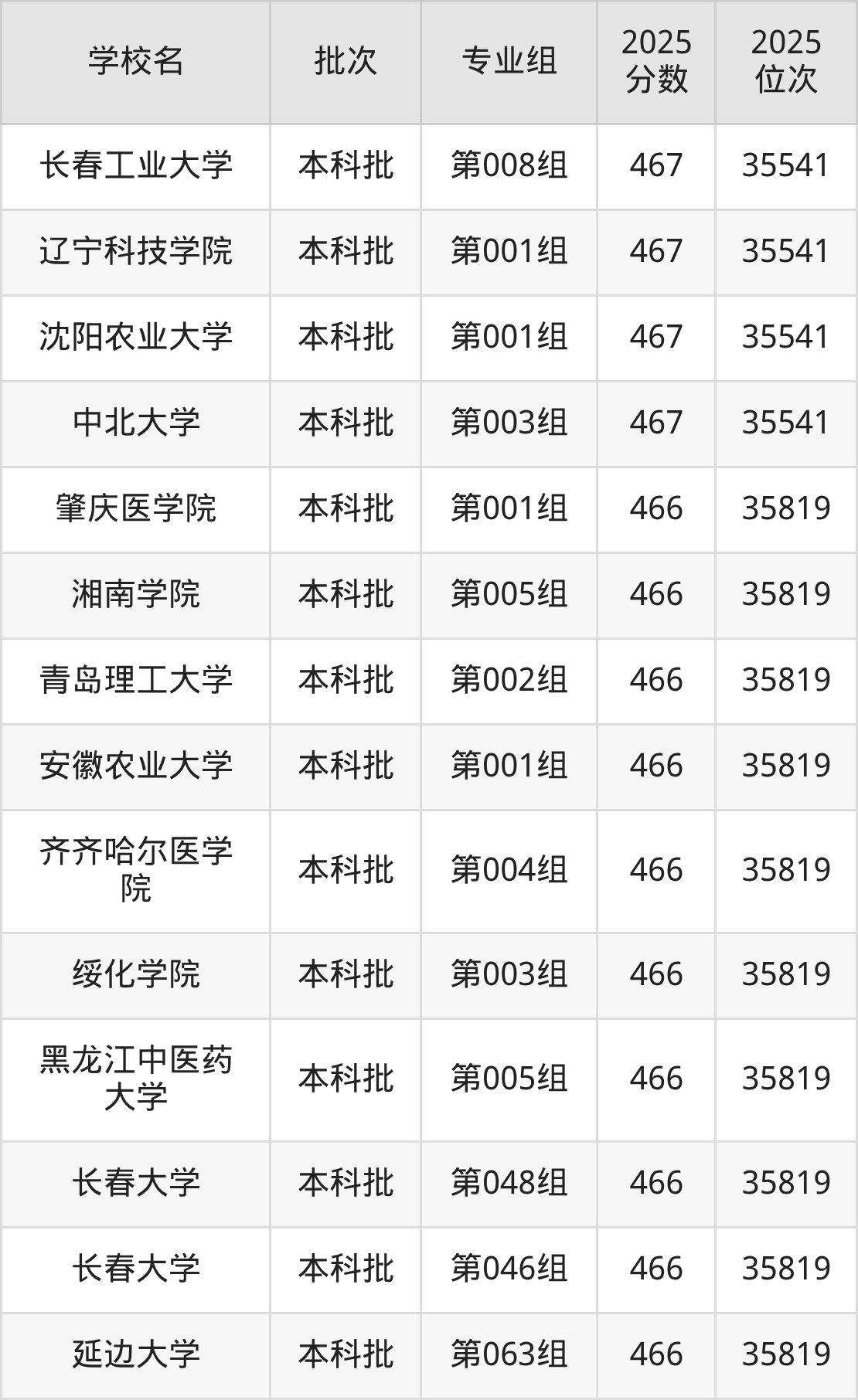 2025年吉林高考物理类467分(35274名~35541名)能上的大学有中北大学第003组、沈阳农业大学第001组、辽宁科技学院第001组、长春工业大学第008组等。