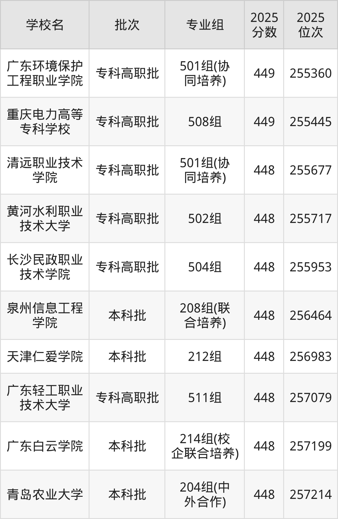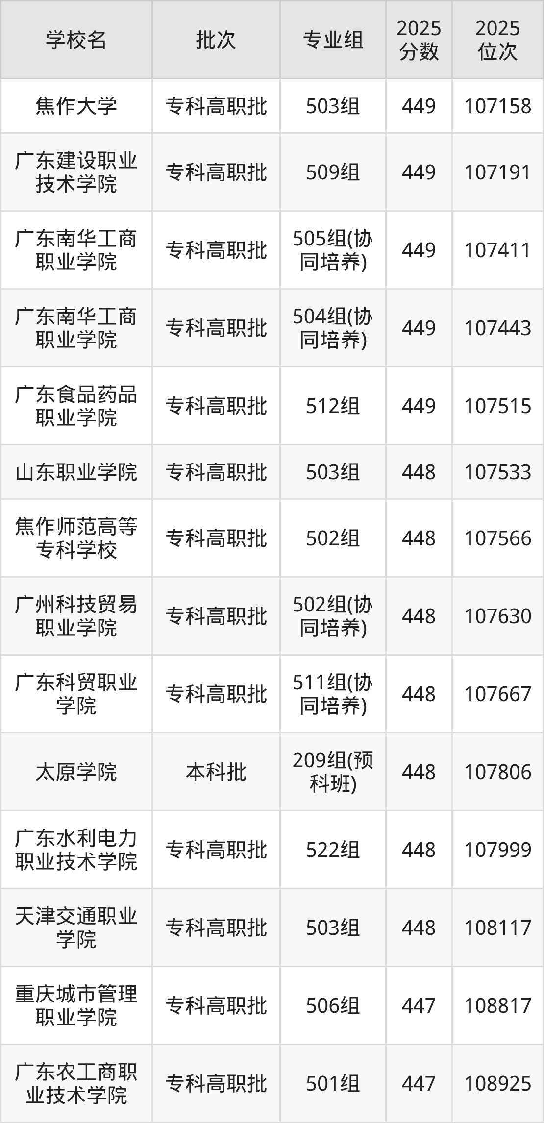 2025年广东高考历史类448分(107510名~108587名)能上的大学有太原学院209组(预科班)、广东水利电力职业技术学院522组、焦作师范高等专科学校502组、山东职业学院503组等。