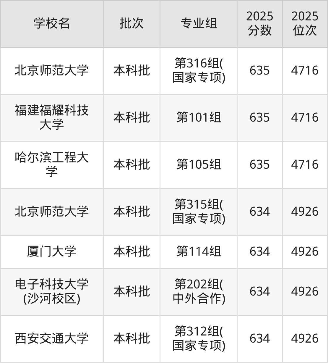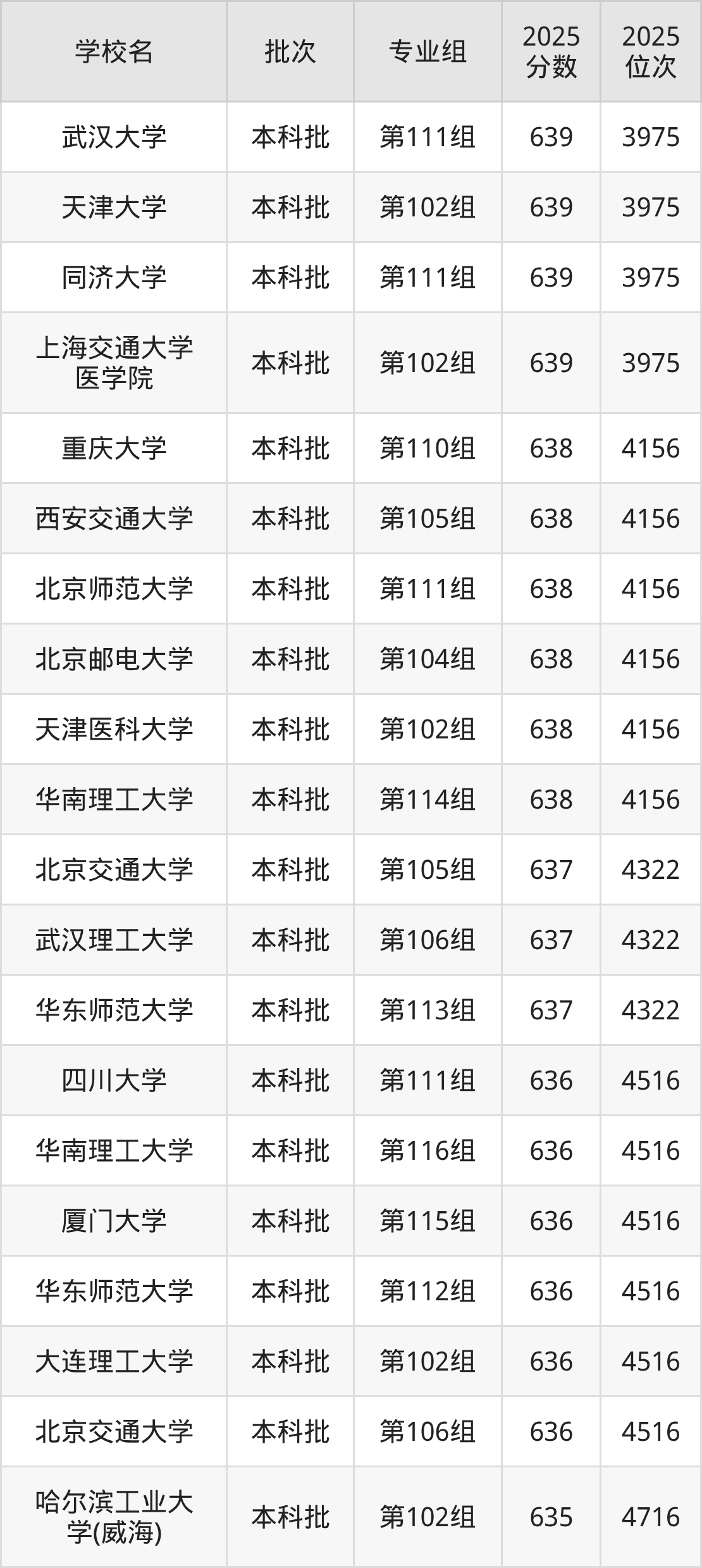 2025年湖南高考物理类636分(4323名~4516名)能上的大学有北京交通大学第106组、大连理工大学第102组、华东师范大学第112组、厦门大学第115组等。