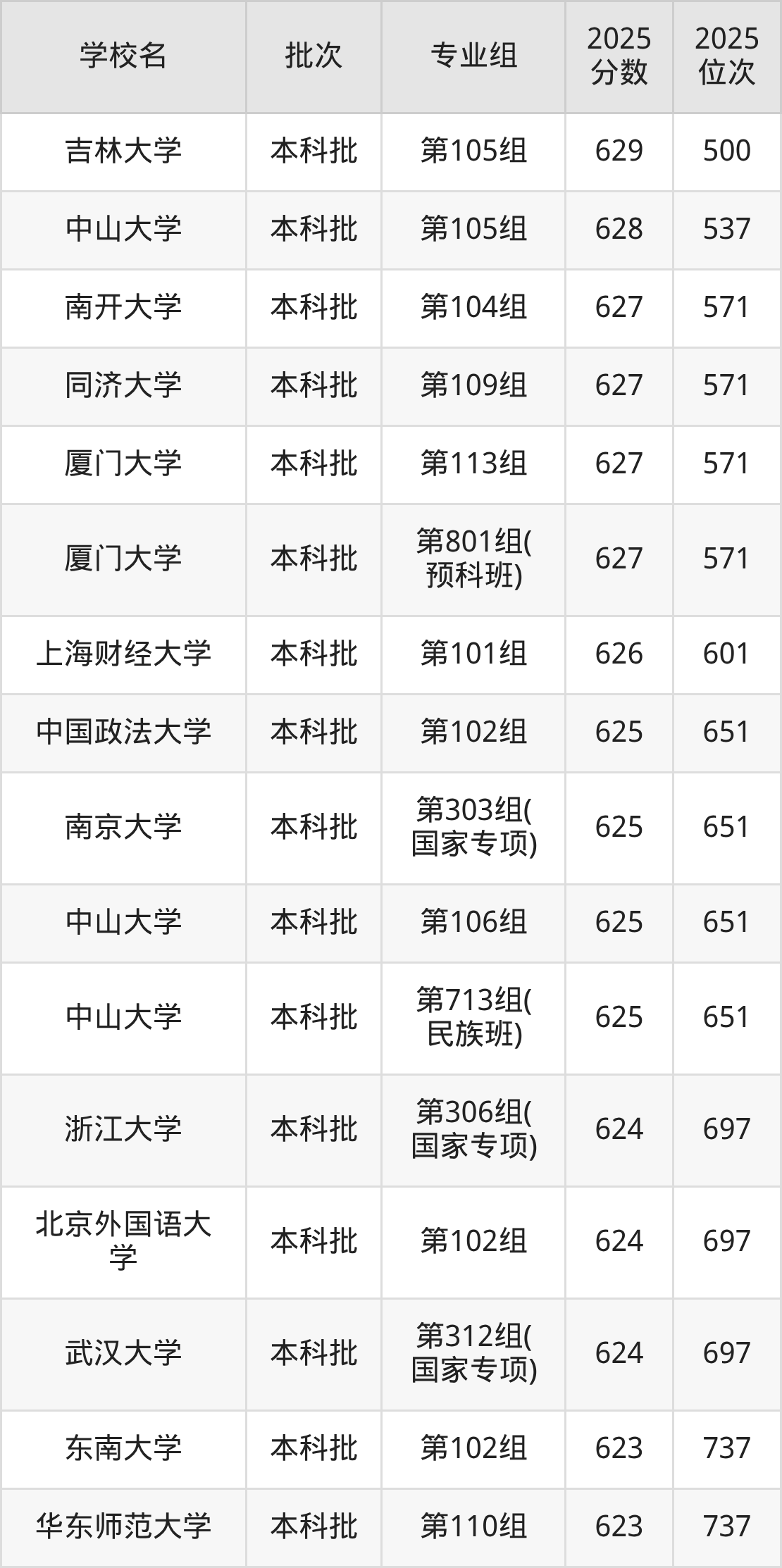 由于高考录取分数线历年波动较大,因此本文以该分数对应的位次排名为大家整理能上的大学名单。