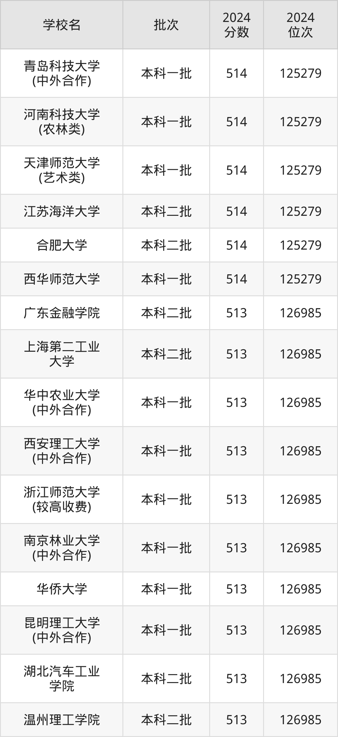 2024年河南高考理科513分(125280名~126985名)能上的大学有华侨大学、广东金融学院、上海第二工业大学、湖北汽车工业学院等。