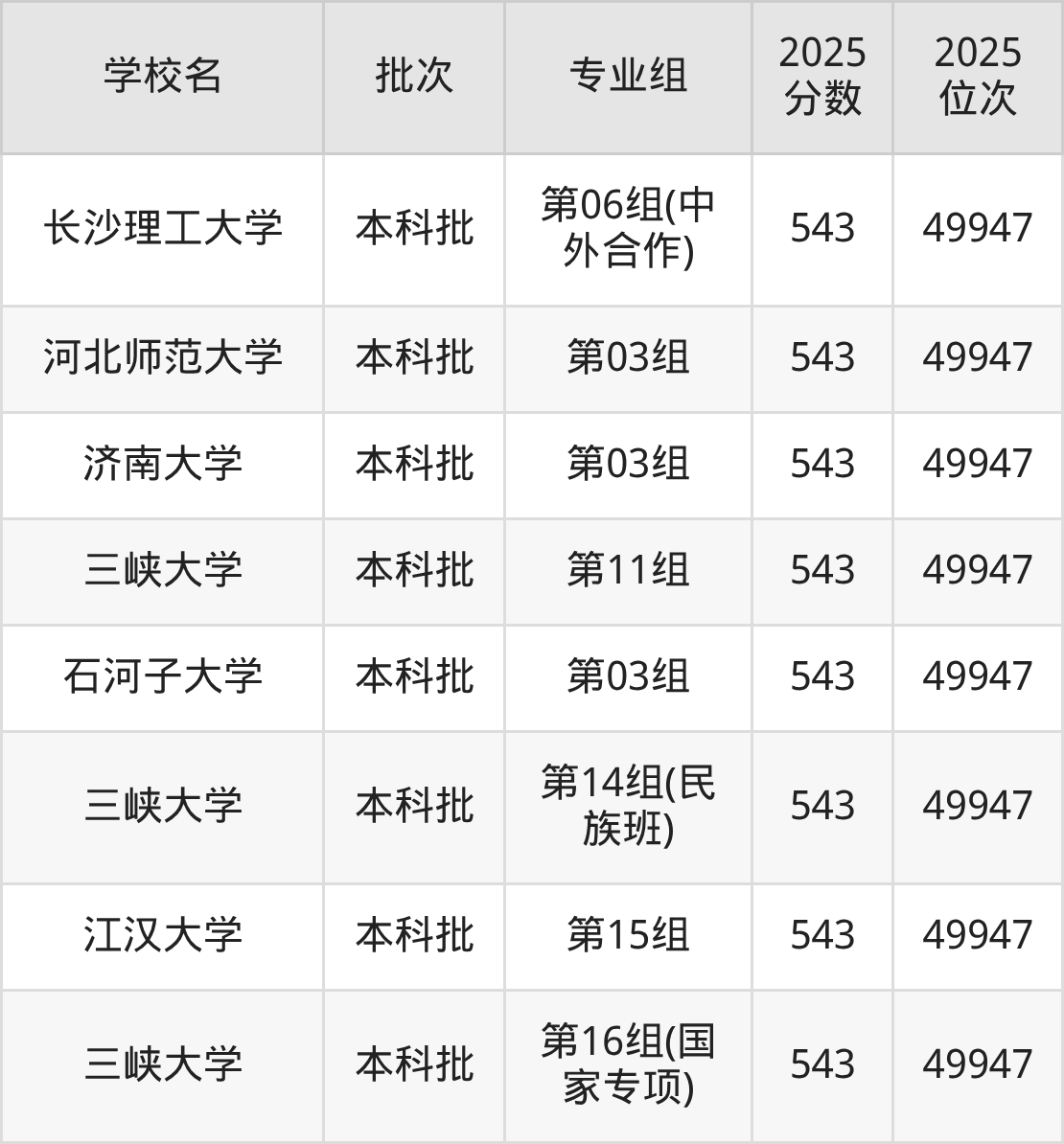 2025年湖北高考物理类543分(49171名~49947名)能上的大学有三峡大学第11组、三峡大学第14组(民族班)、三峡大学第16组(国家专项)、江汉大学第15组等。