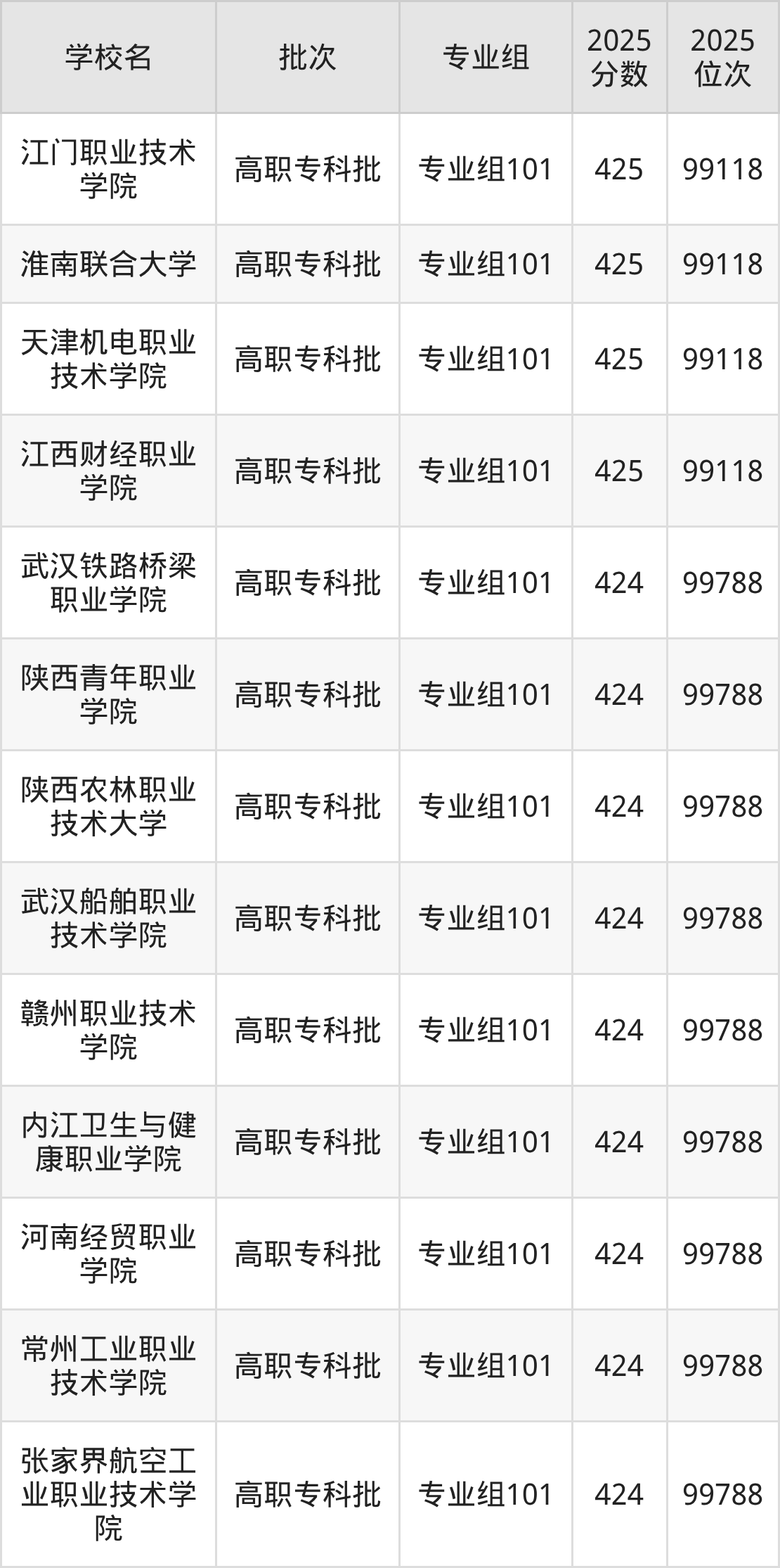 2025年四川高考历史类424分(99119名~99788名)能上的大学有陕西青年职业学院专业组101、武汉铁路桥梁职业学院专业组101、陕西农林职业技术大学专业组101、常州工业职业技术学院专业组101等。
