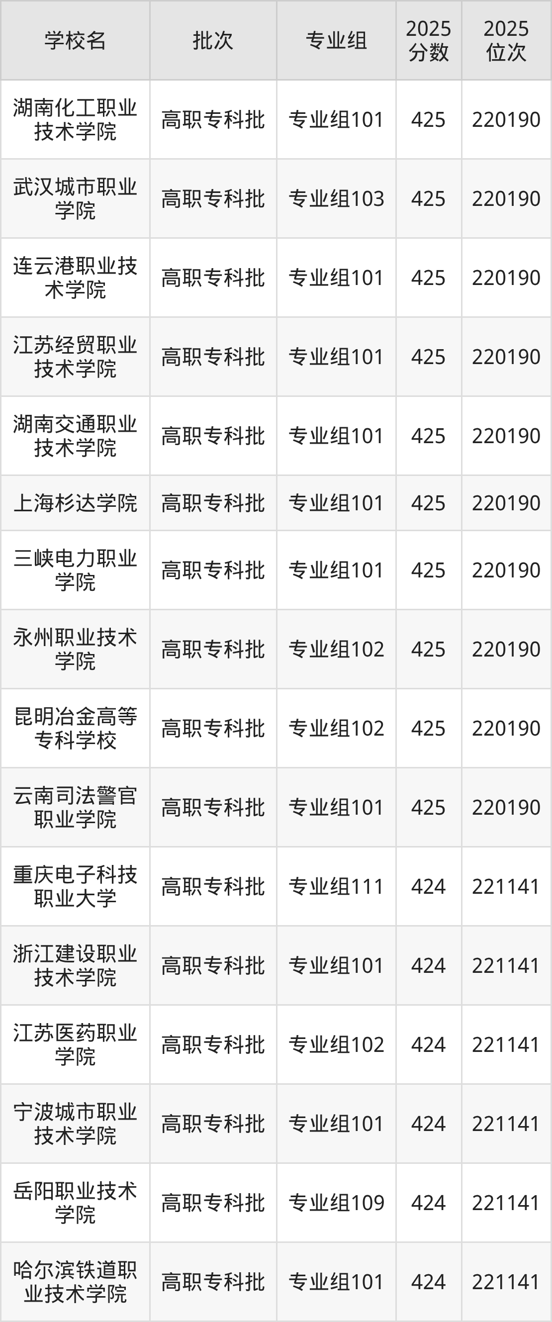 2025年四川高考物理类424分(220191名~221141名)能上的大学有重庆电子科技职业大学专业组111、宁波城市职业技术学院专业组101、岳阳职业技术学院专业组109、哈尔滨铁道职业技术学院专业组101等。